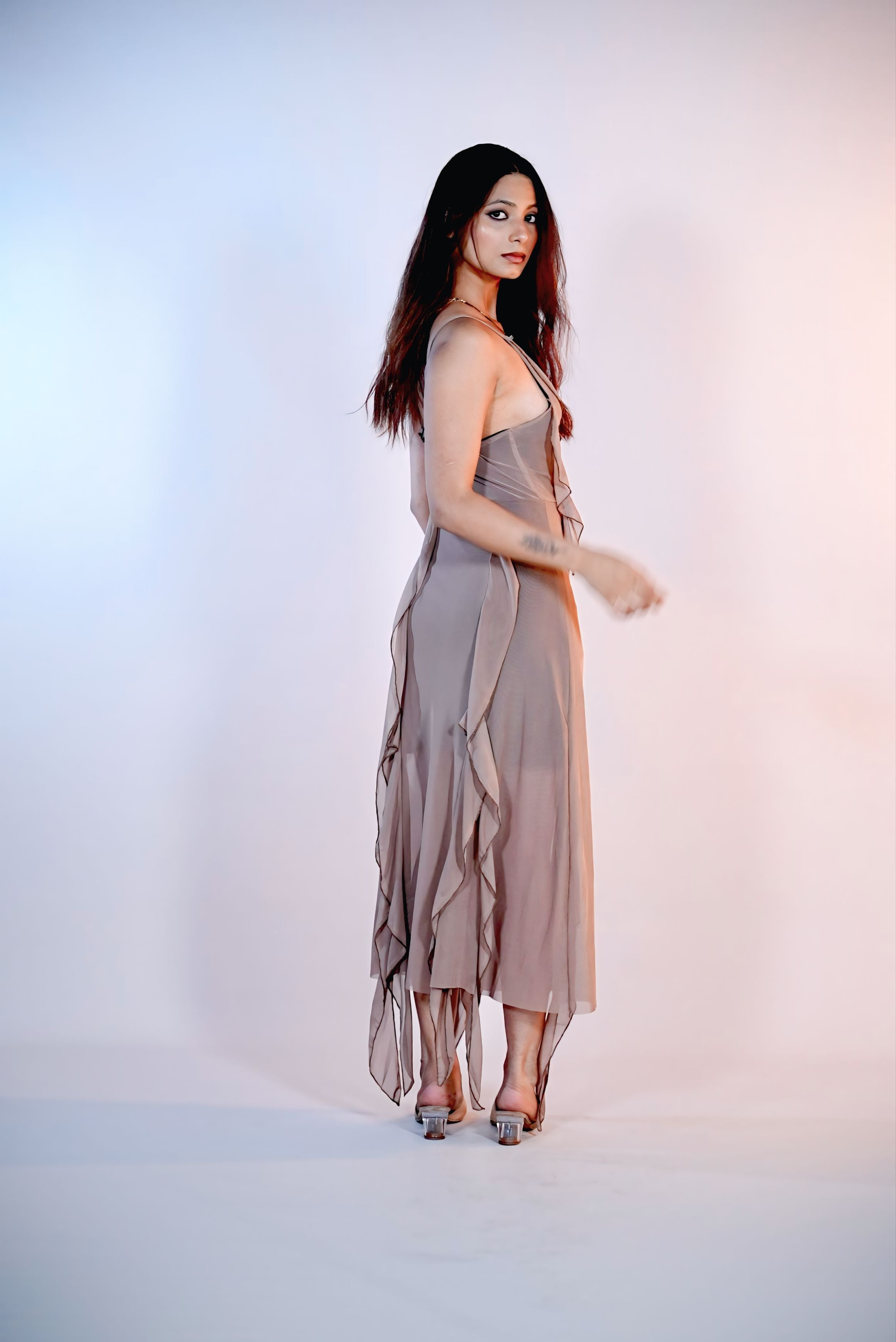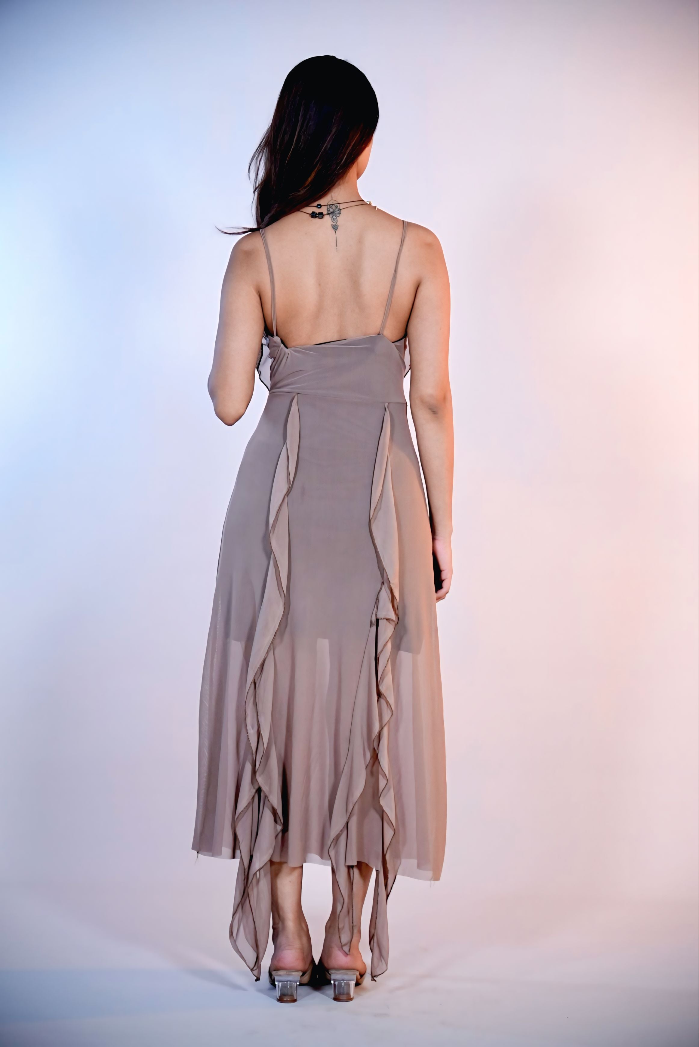 A graceful ruffle dress crafted in lightweight chiffon, featuring delicate spaghetti straps, a flattering V-neckline, and cascading asymmetrical ruffles that flow down the front and hem. The semi-sheer lower layer adds movement and elegance, while the inner lining ensures comfortable coverage. Perfect for brunches, resort evenings, or romantic date nights.