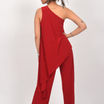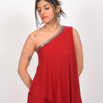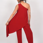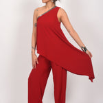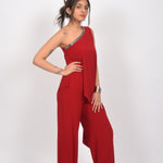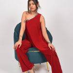 Make a bold statement with this striking red one-shoulder cord set. The asymmetrical flow of the top, accentuated with shimmering embellished lace, adds a touch of glamour. Perfect for evening parties or special occasions where you want to stand out with confidence.