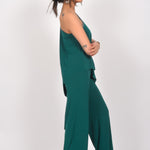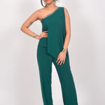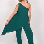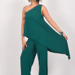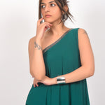 A blend of sophistication and modernity, this teal one-shoulder cord set is ideal for those who love a subtle yet elegant look. The asymmetrical drape and the delicate shimmer of the embellished lace make it a perfect outfit for both formal and semi-casual settings.