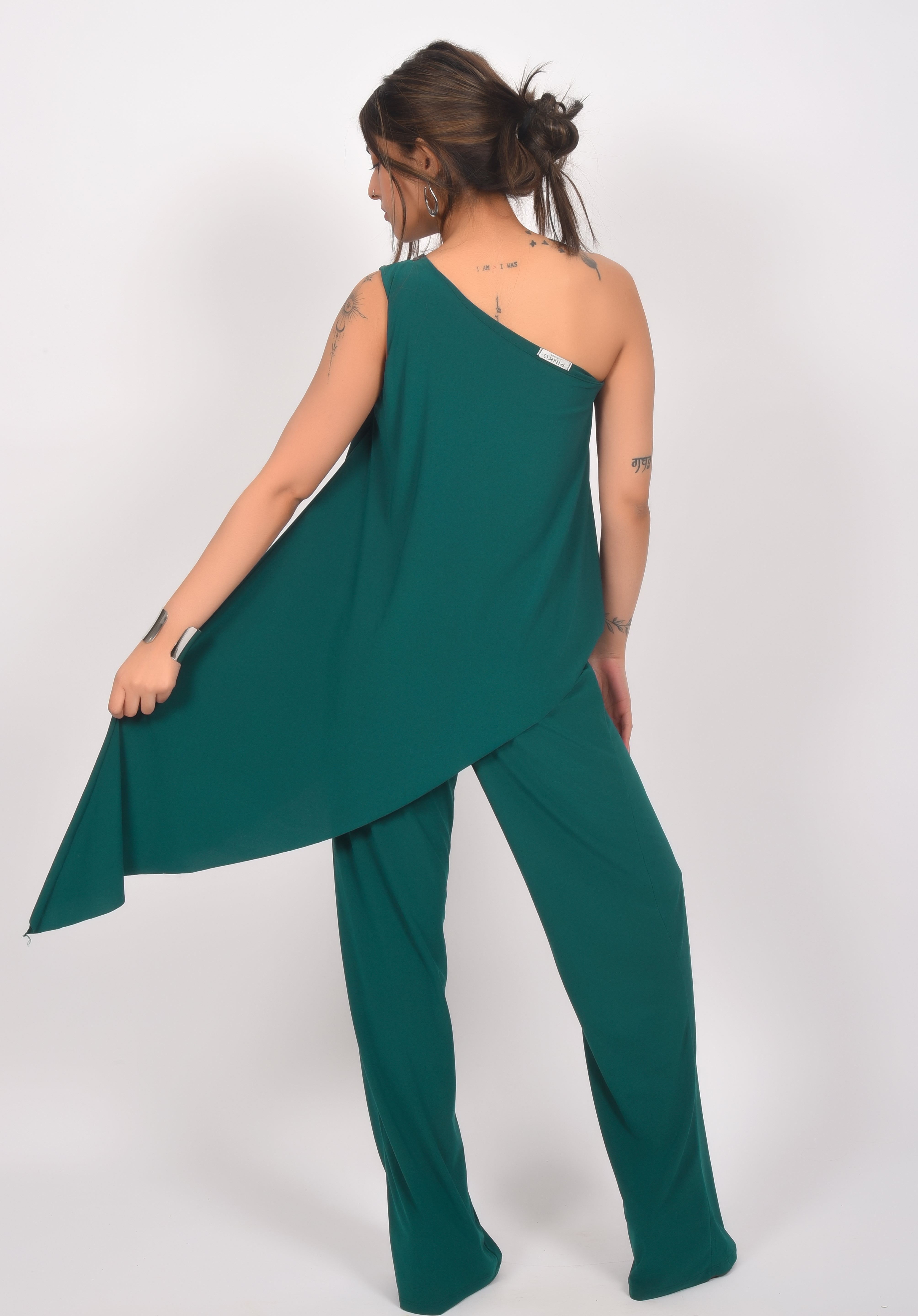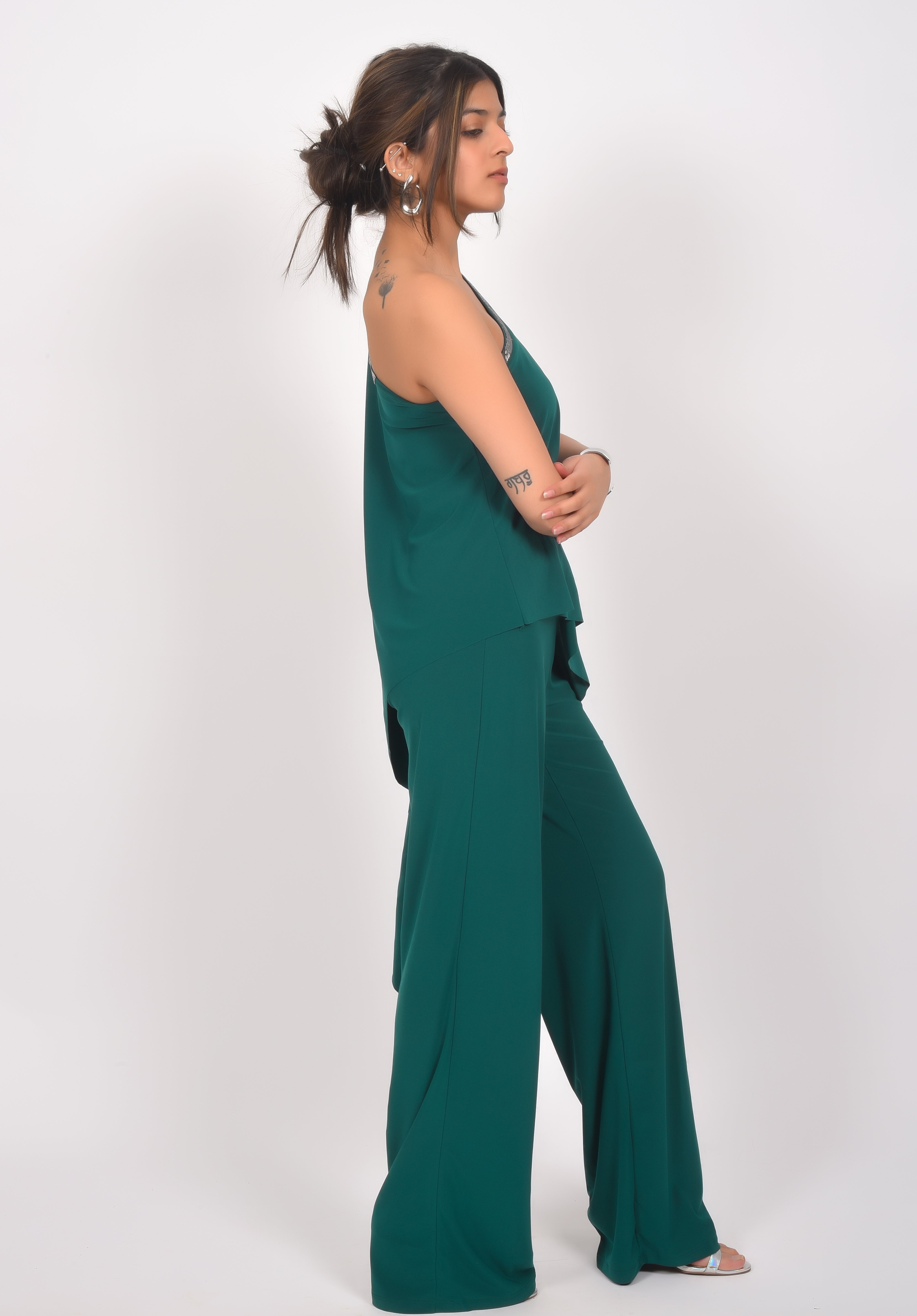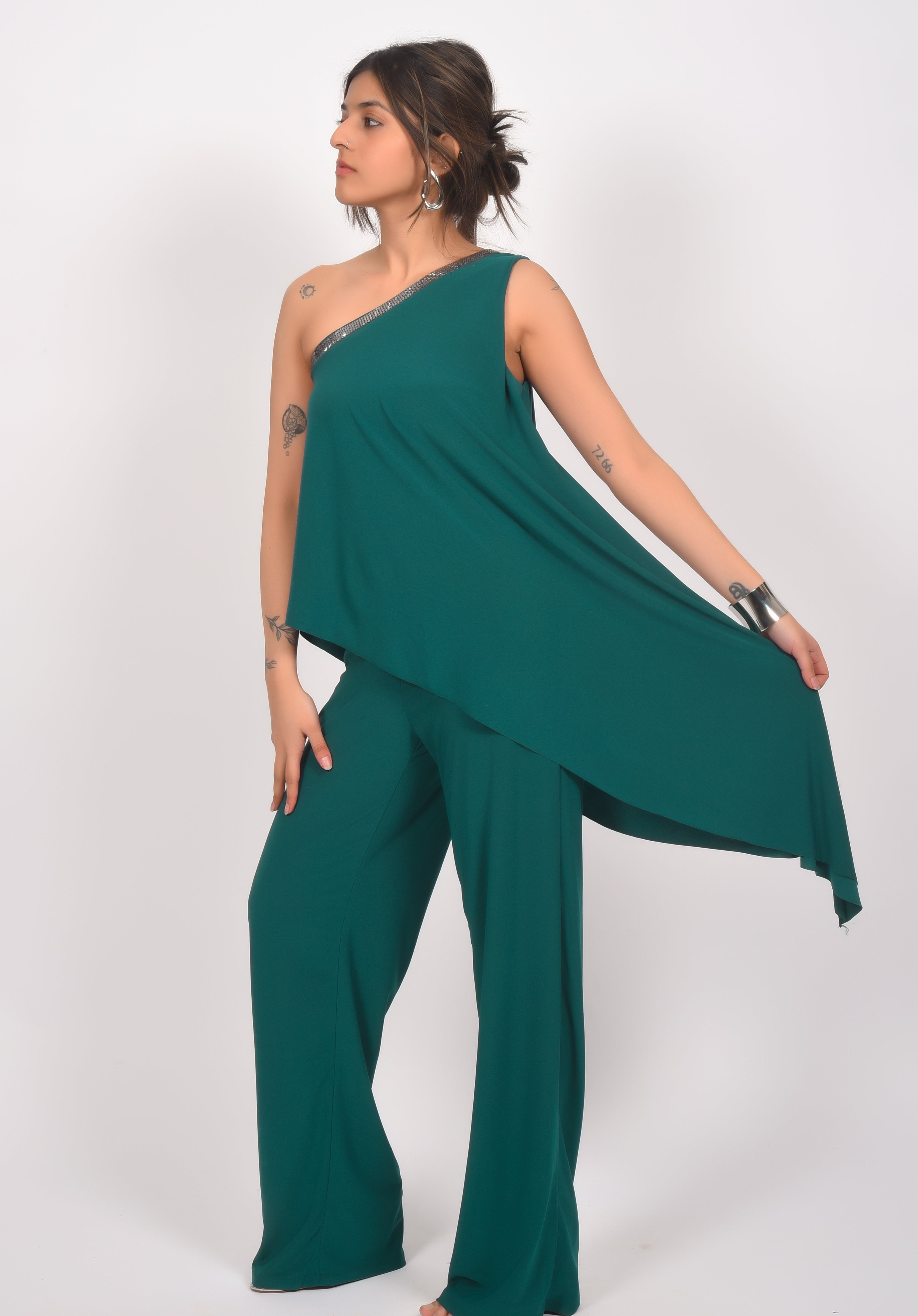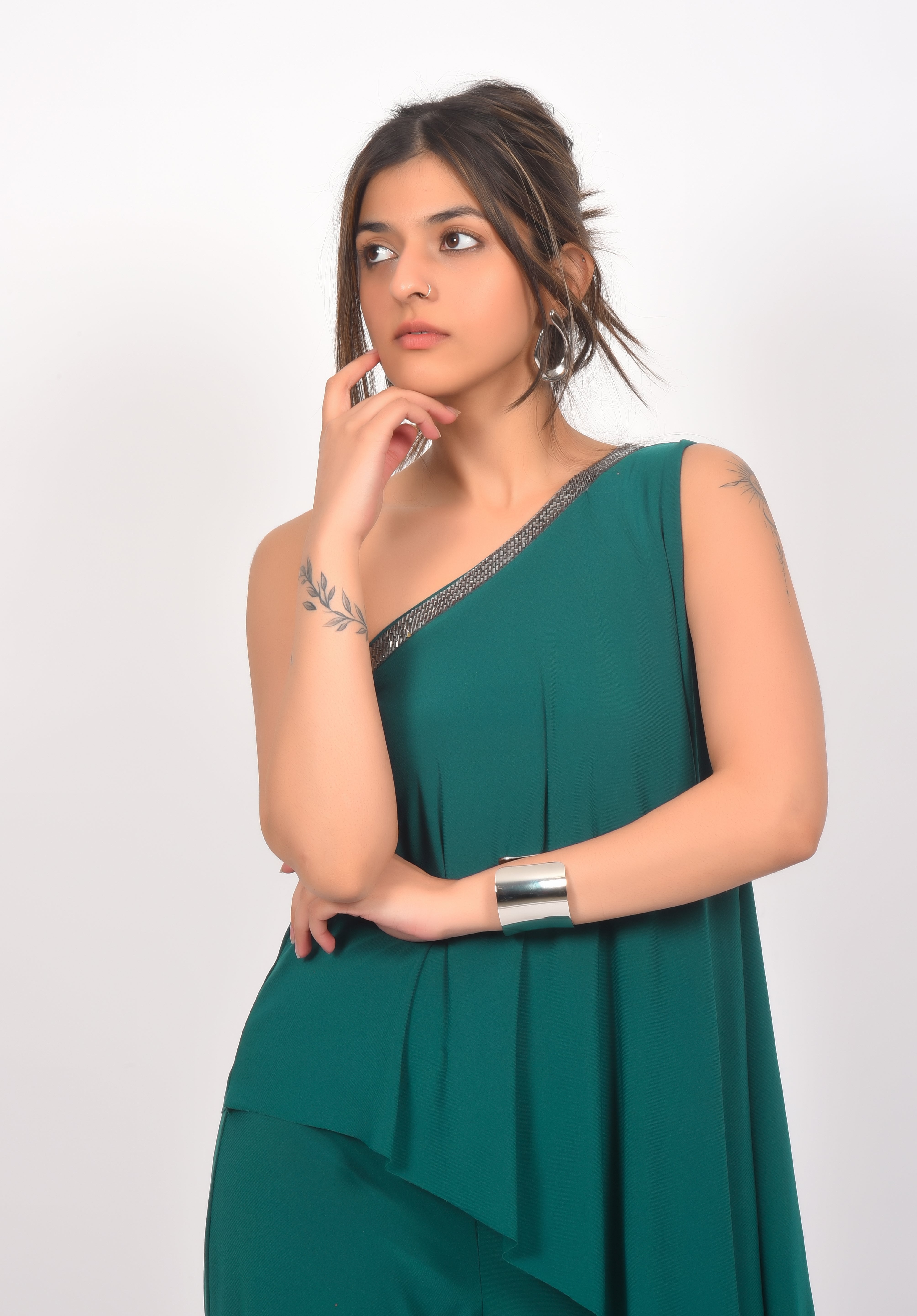 A blend of sophistication and modernity, this teal one-shoulder cord set is ideal for those who love a subtle yet elegant look. The asymmetrical drape and the delicate shimmer of the embellished lace make it a perfect outfit for both formal and semi-casual settings.