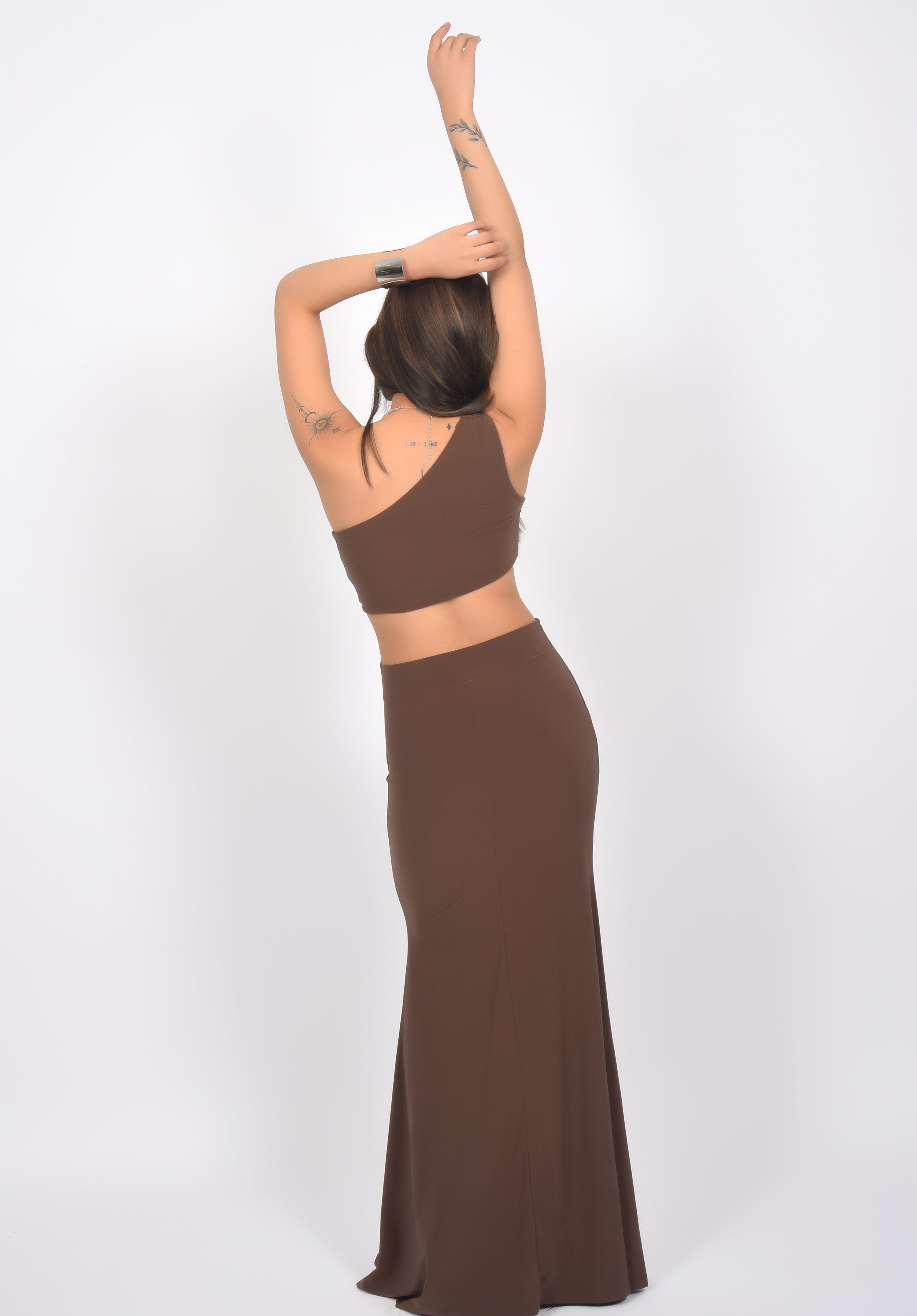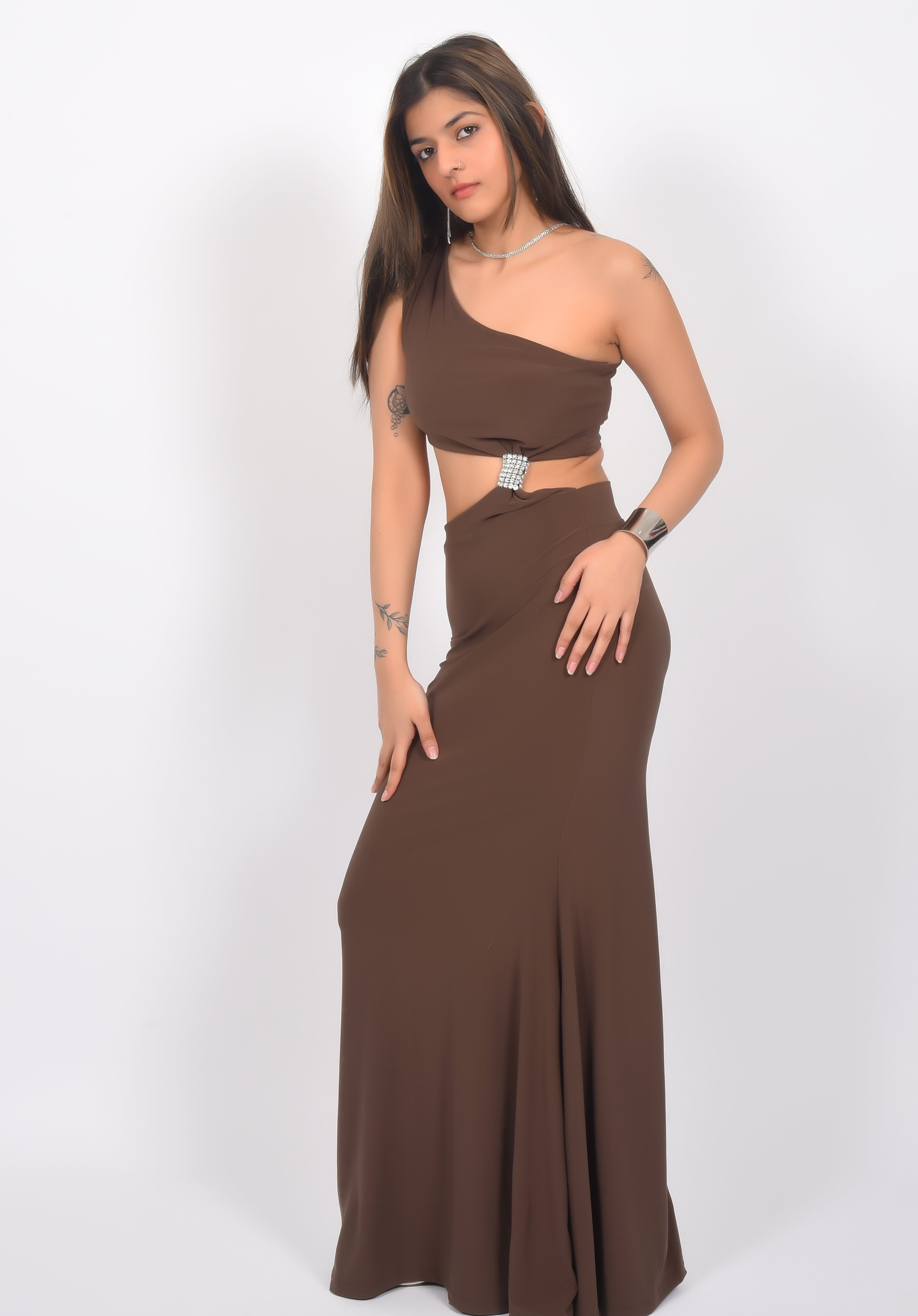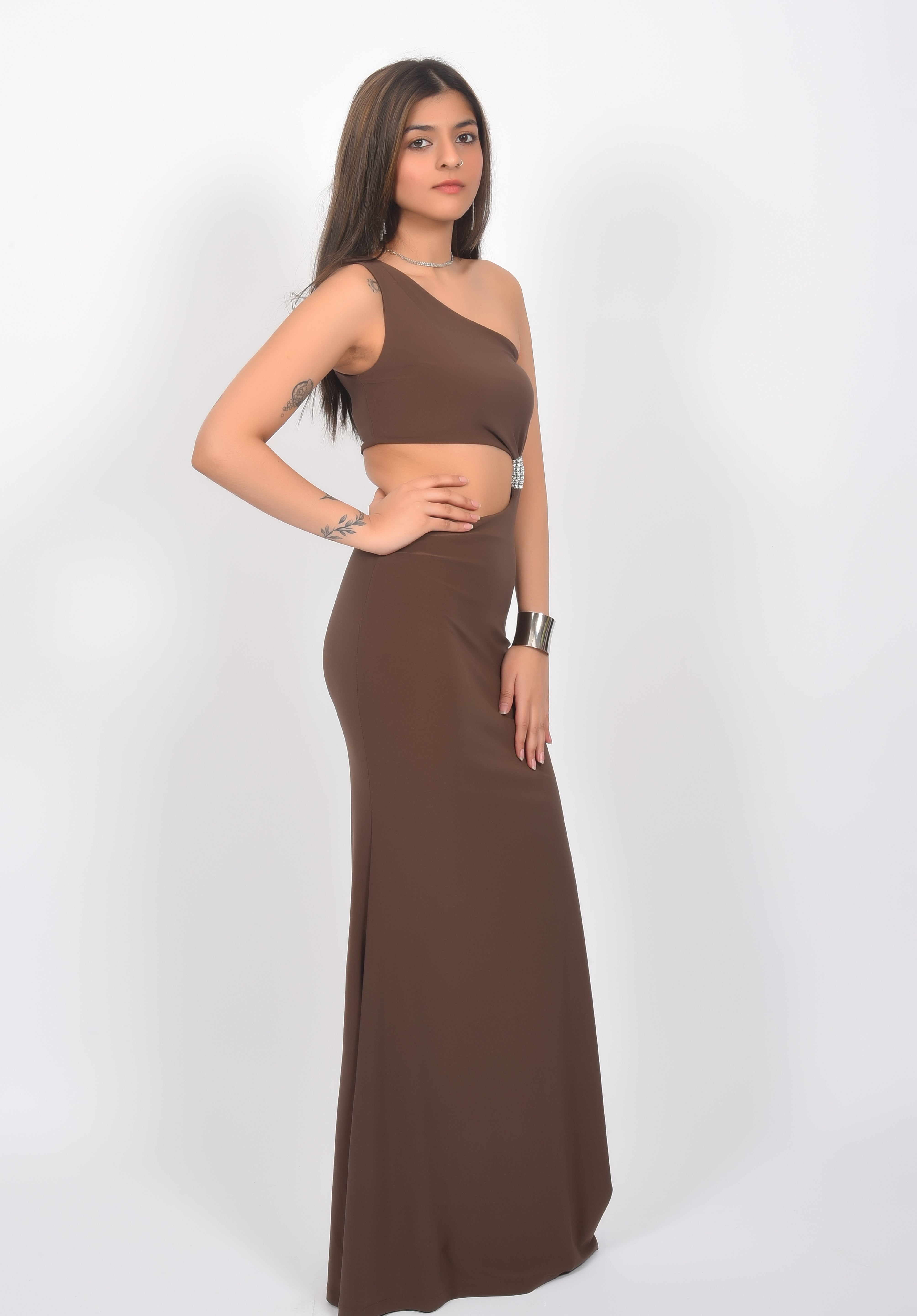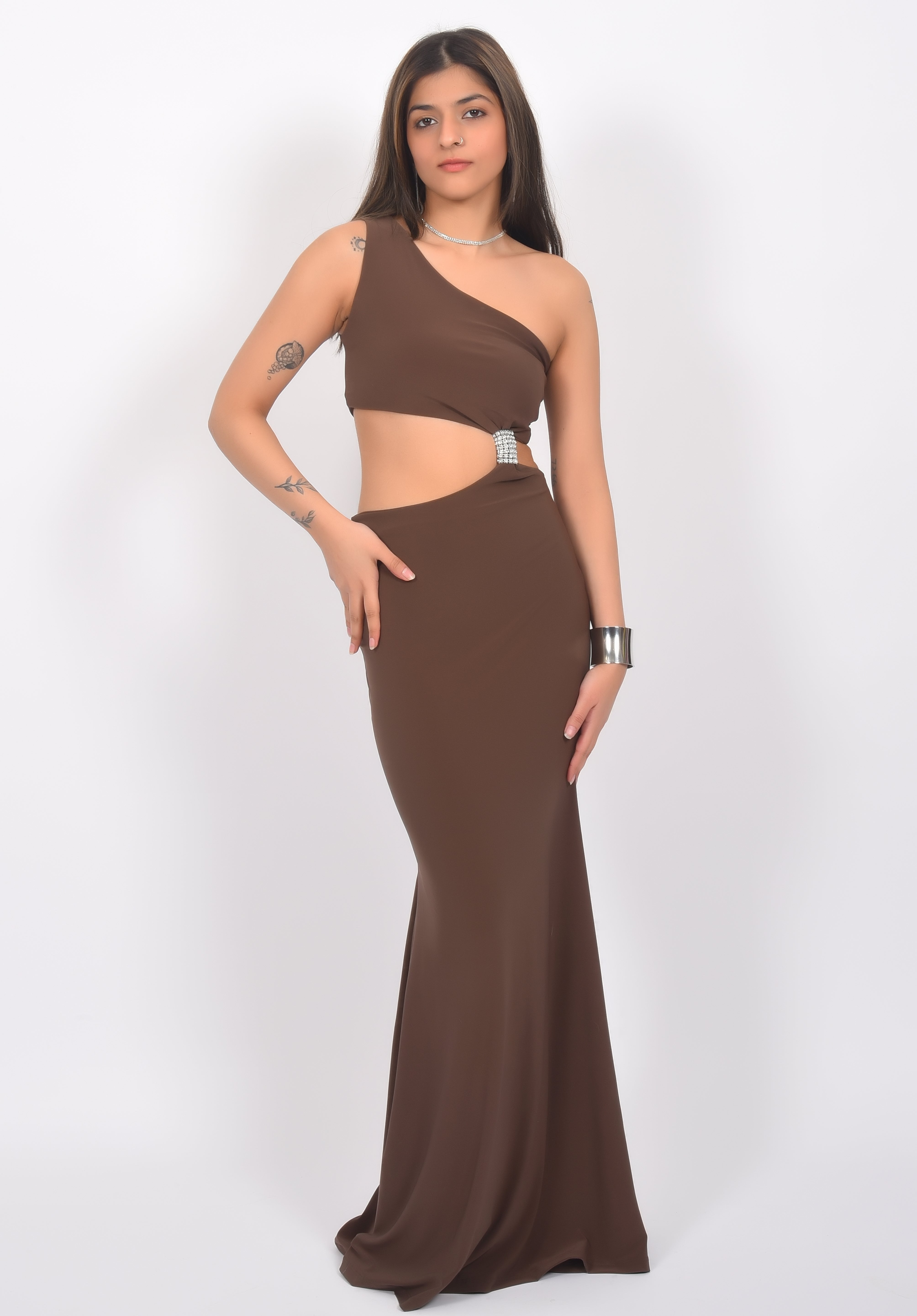 Make a bold statement with the Mocha Temptation Cutout Dress. Designed in a sleek, bodycon silhouette, this long maxi dress features a striking one-shoulder neckline and elegant side cutouts accentuated by a shimmering embellished detail. Crafted from Premium Lycra fabric, it offers a flattering stretch fit that enhances your curves effortlessly. This gown is the perfect pick for evening soirées, formal events, or a glamorous night out.