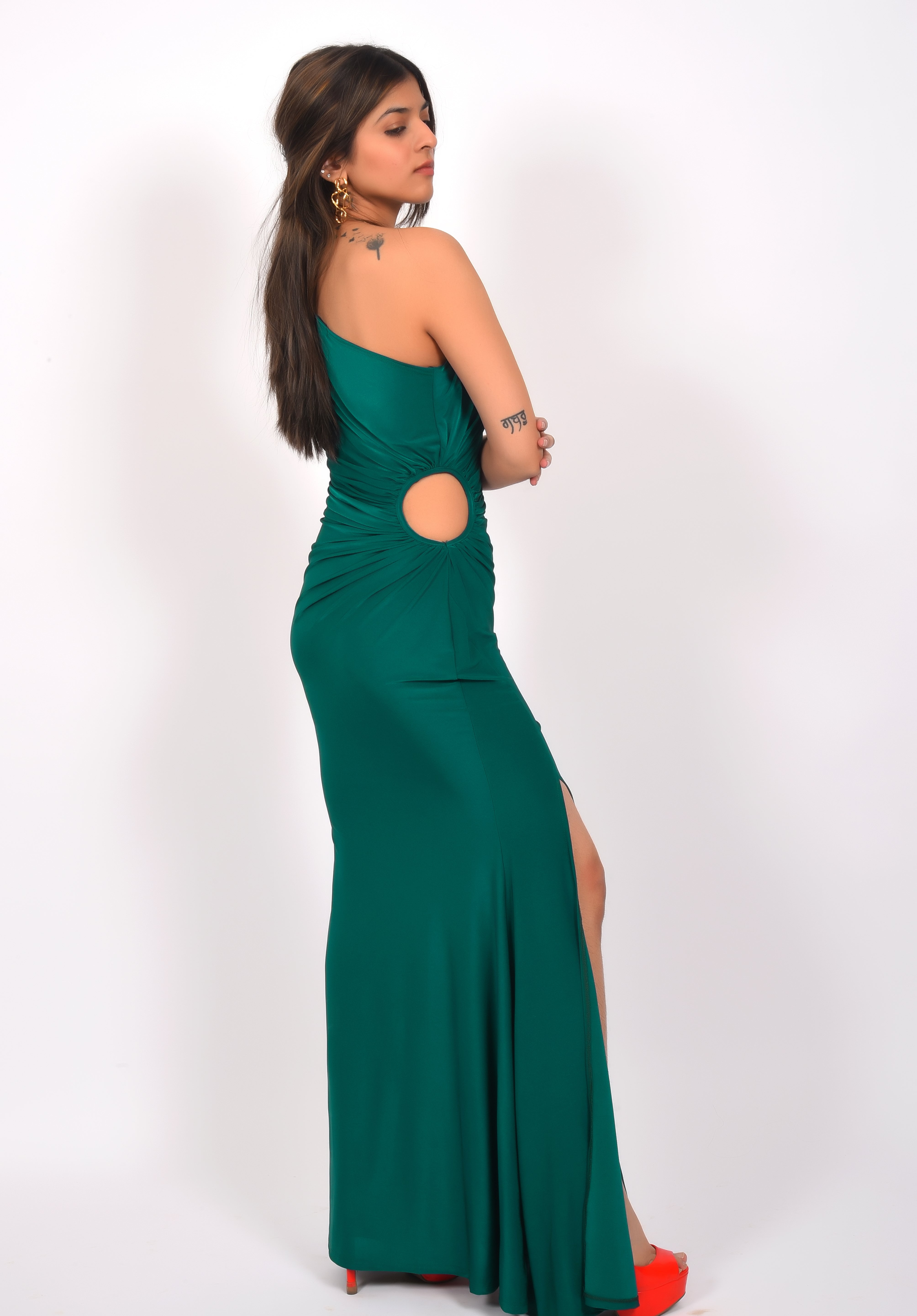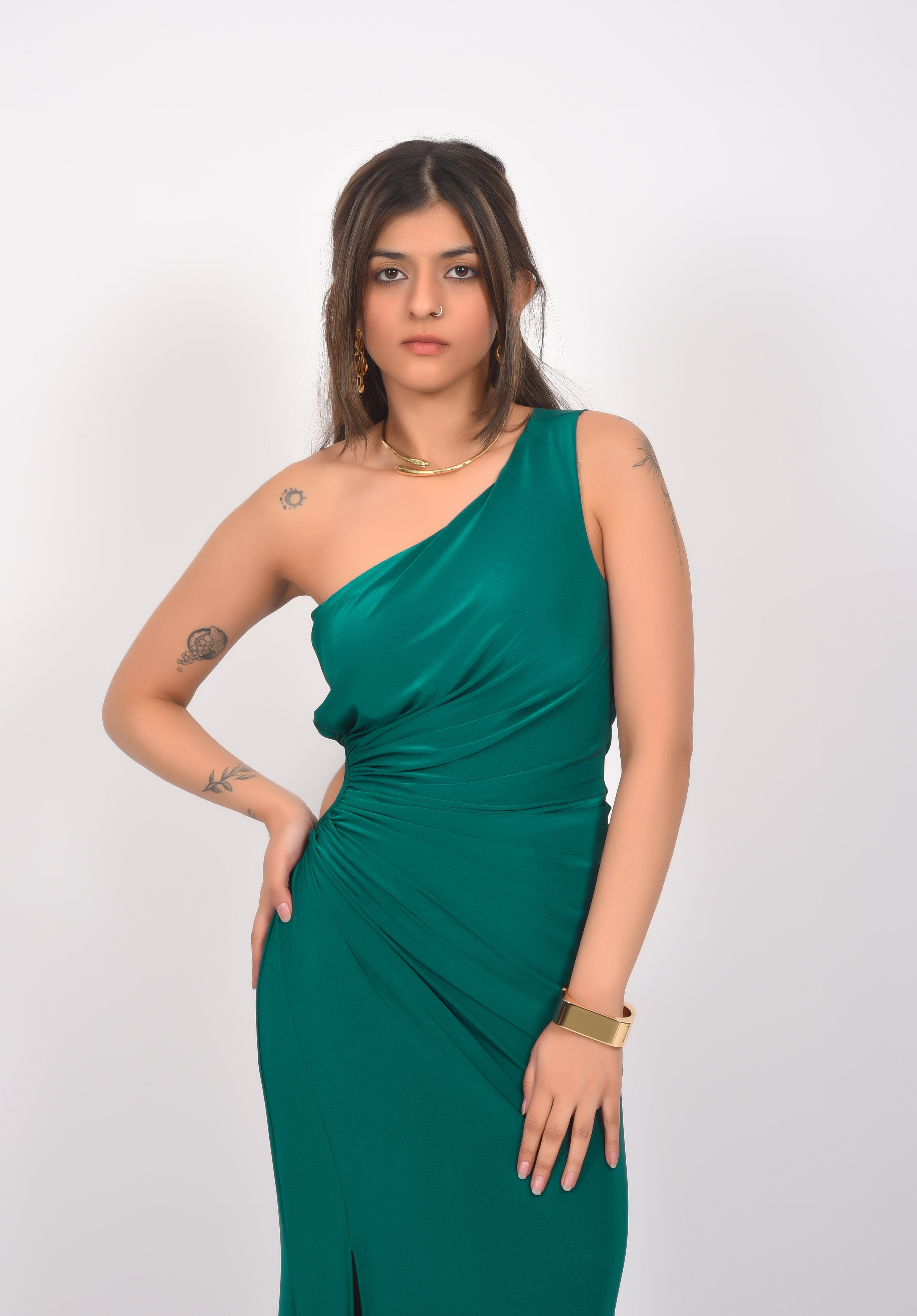 Make a bold statement with our One-Shoulder Ruched Lycra Gown, designed to enhance your curves with its sleek, body-hugging fit. This stunning full-length dress features: