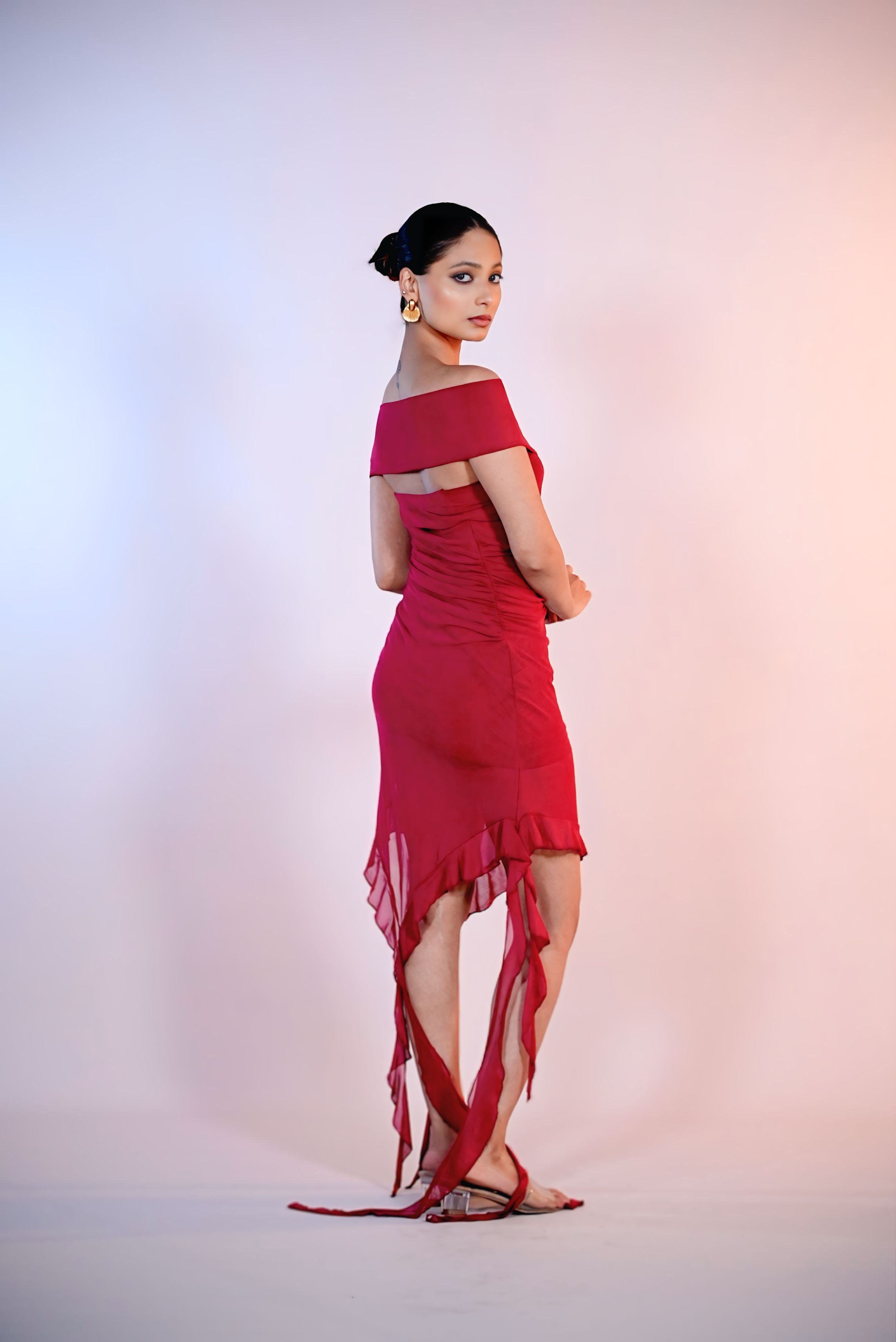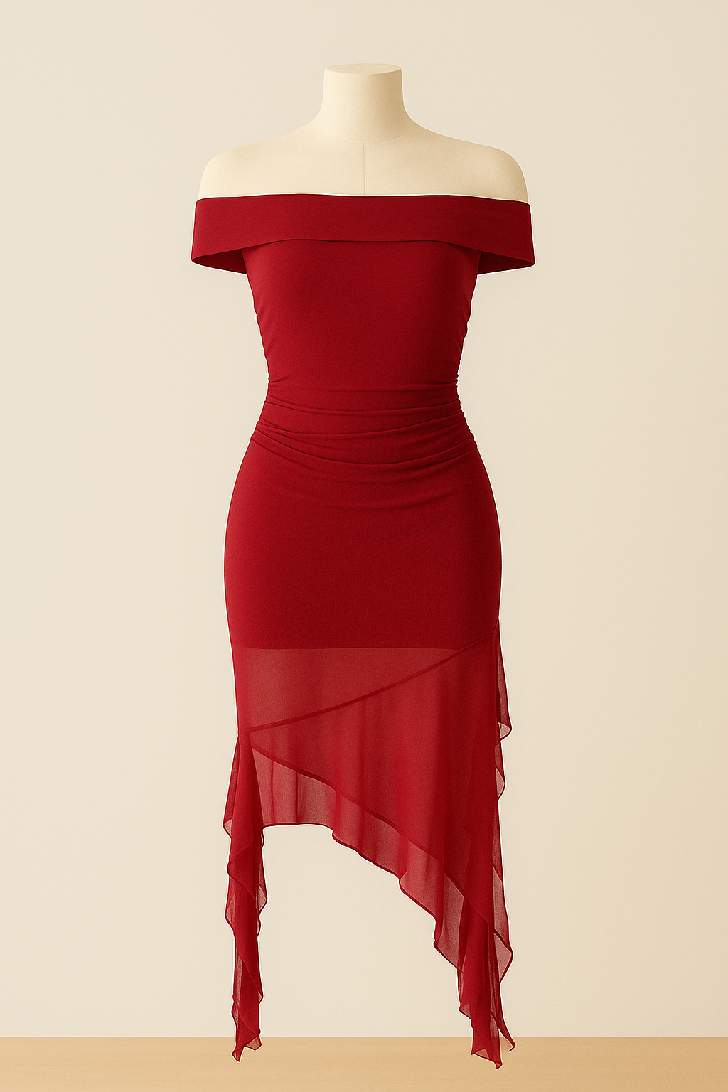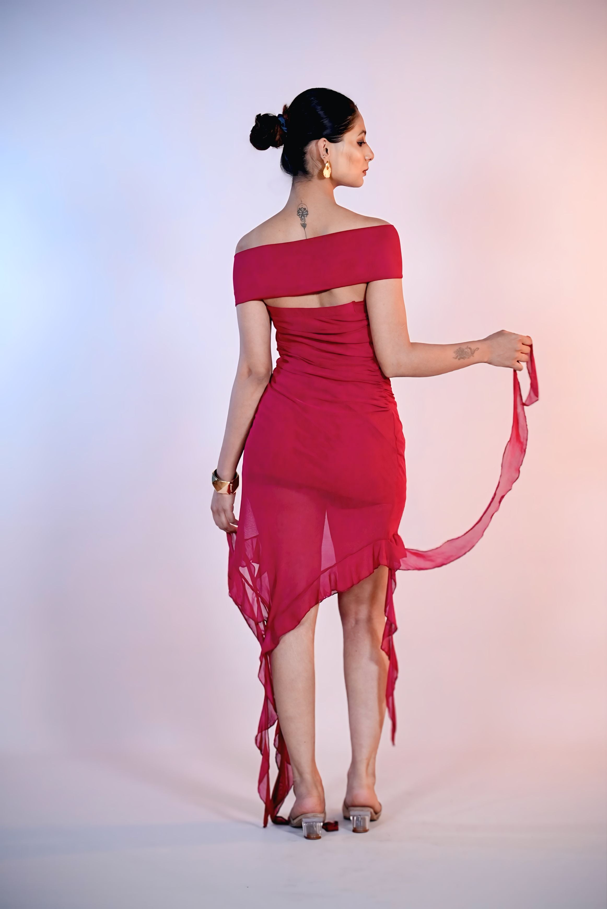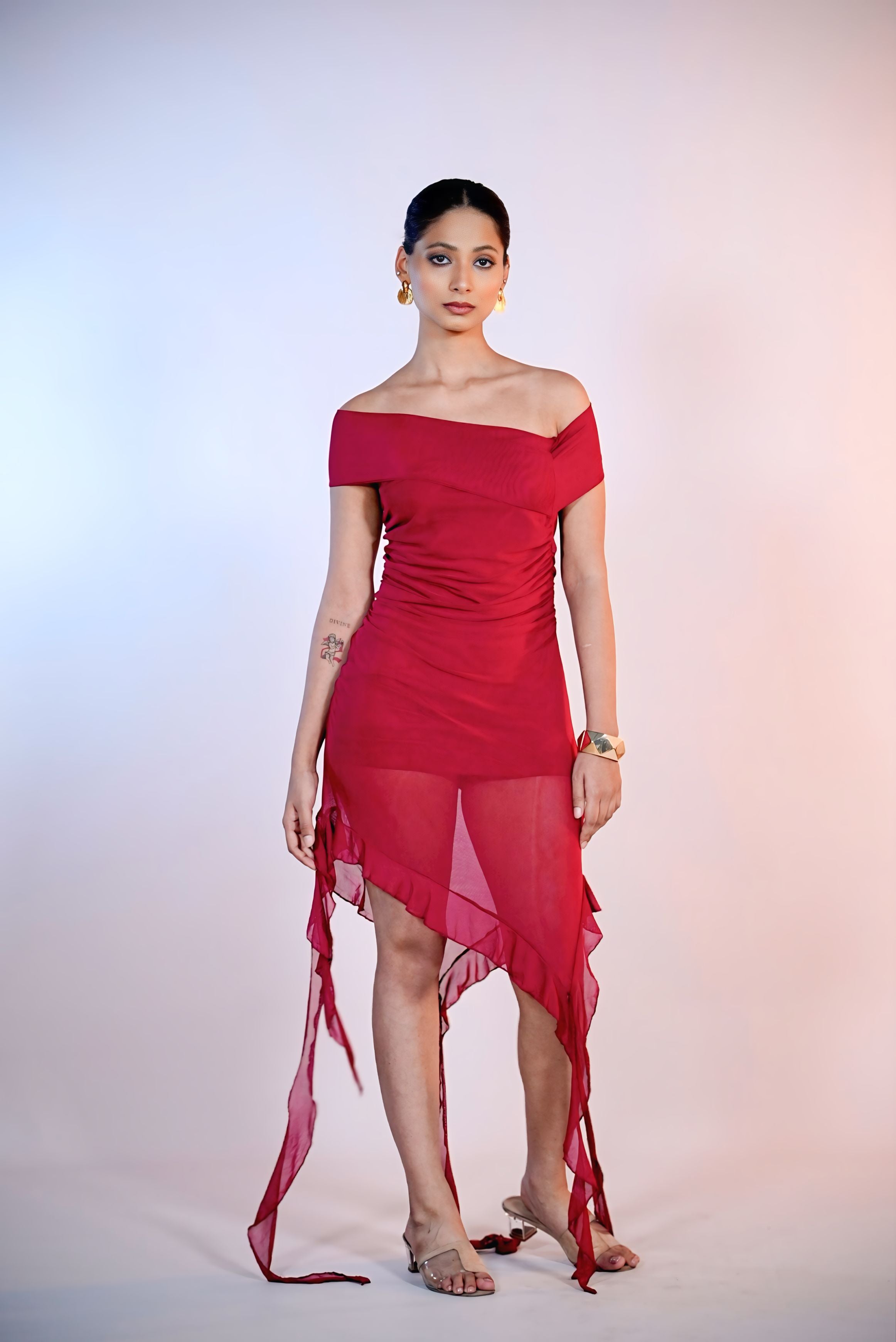 The Ruffle Mesh Dress is a dreamy off-shoulder silhouette crafted in soft lycra mesh. Featuring a ruched bodice, a sheer asymmetrical hemline, and cascading chiffon-style tails, this piece is made to move with elegance. Its stretchable bodycon fit flatters your curves while the layered mesh adds drama and flair — perfect for evening events, date nights, or statement summer styling.