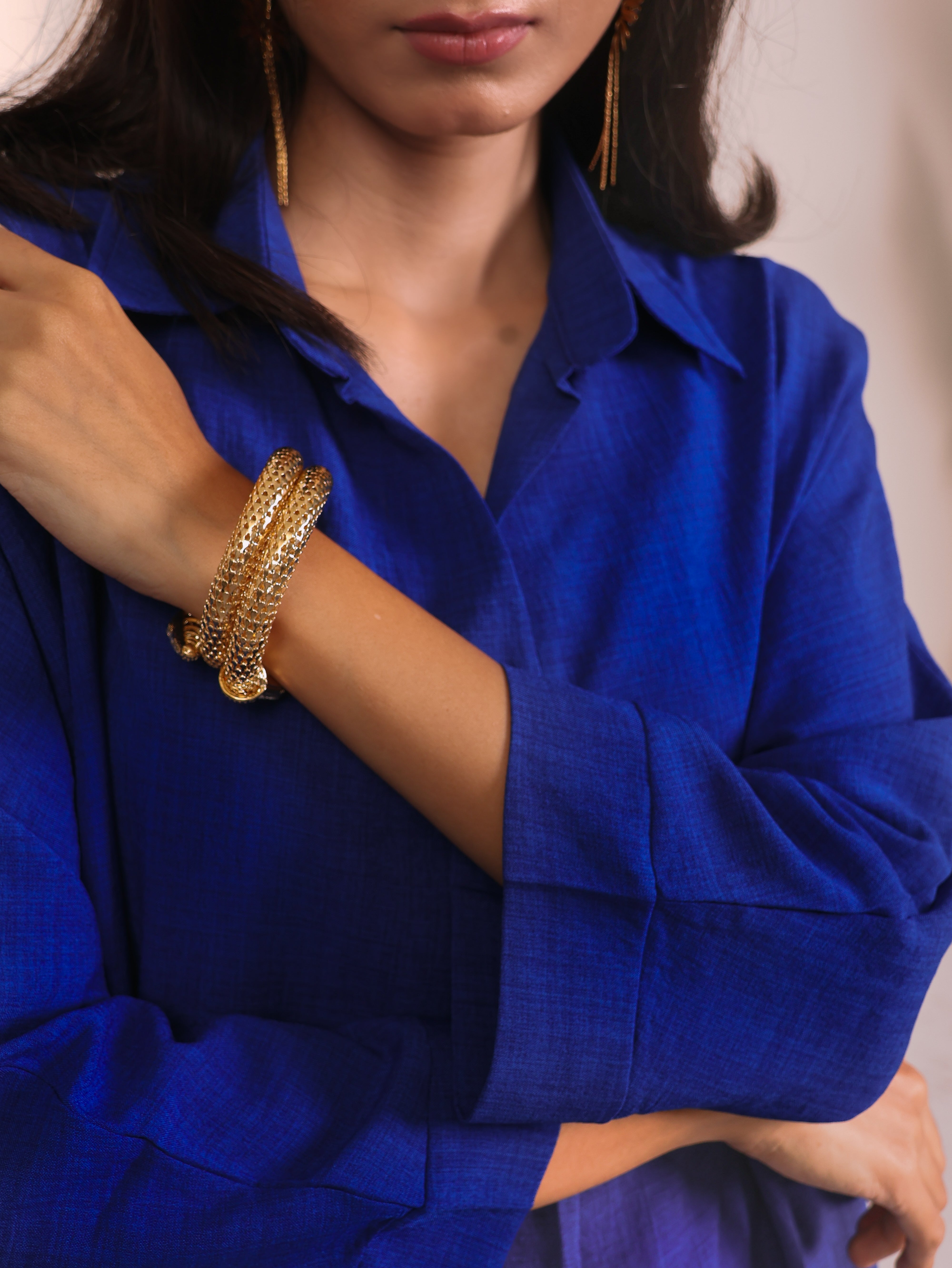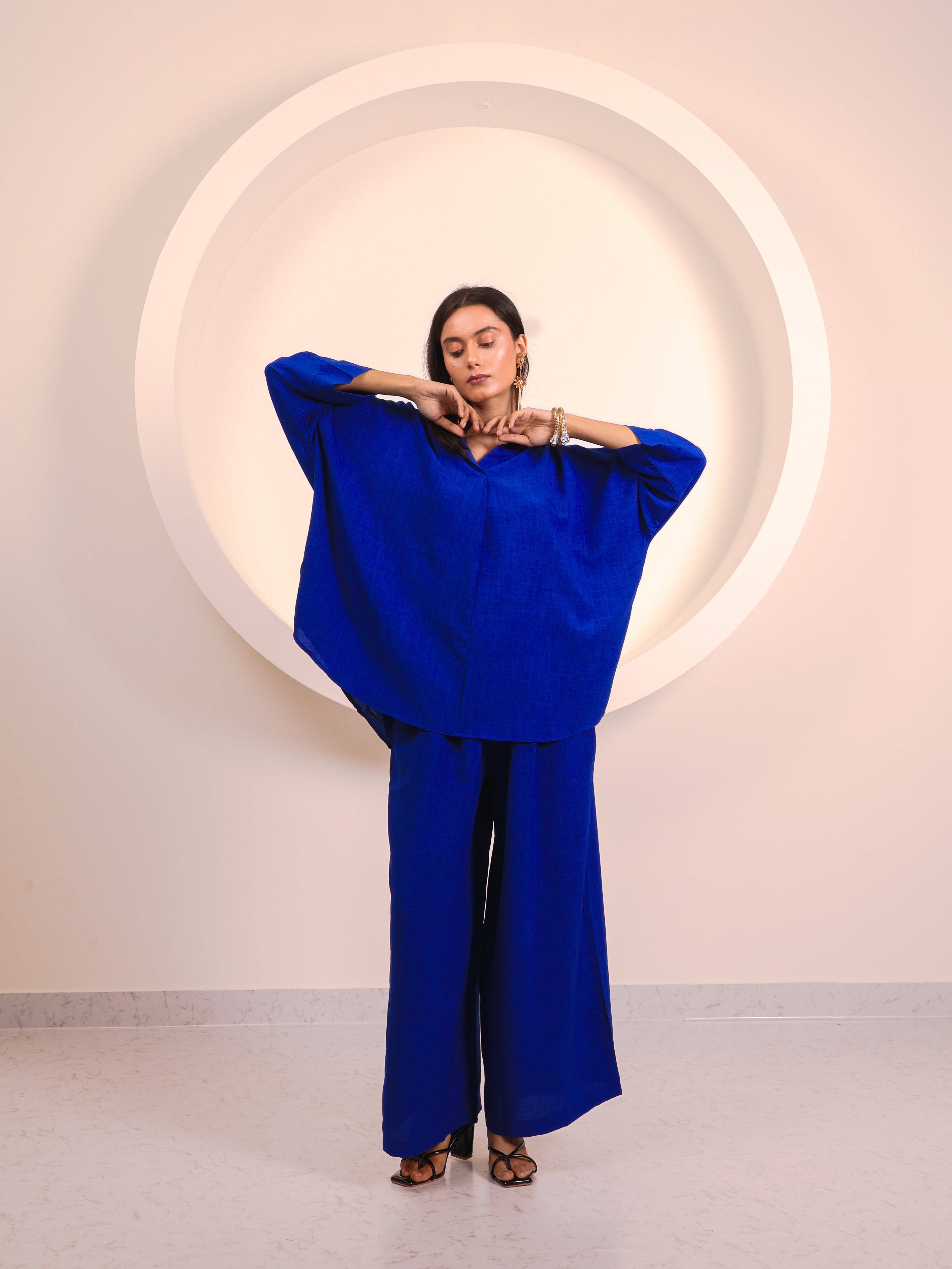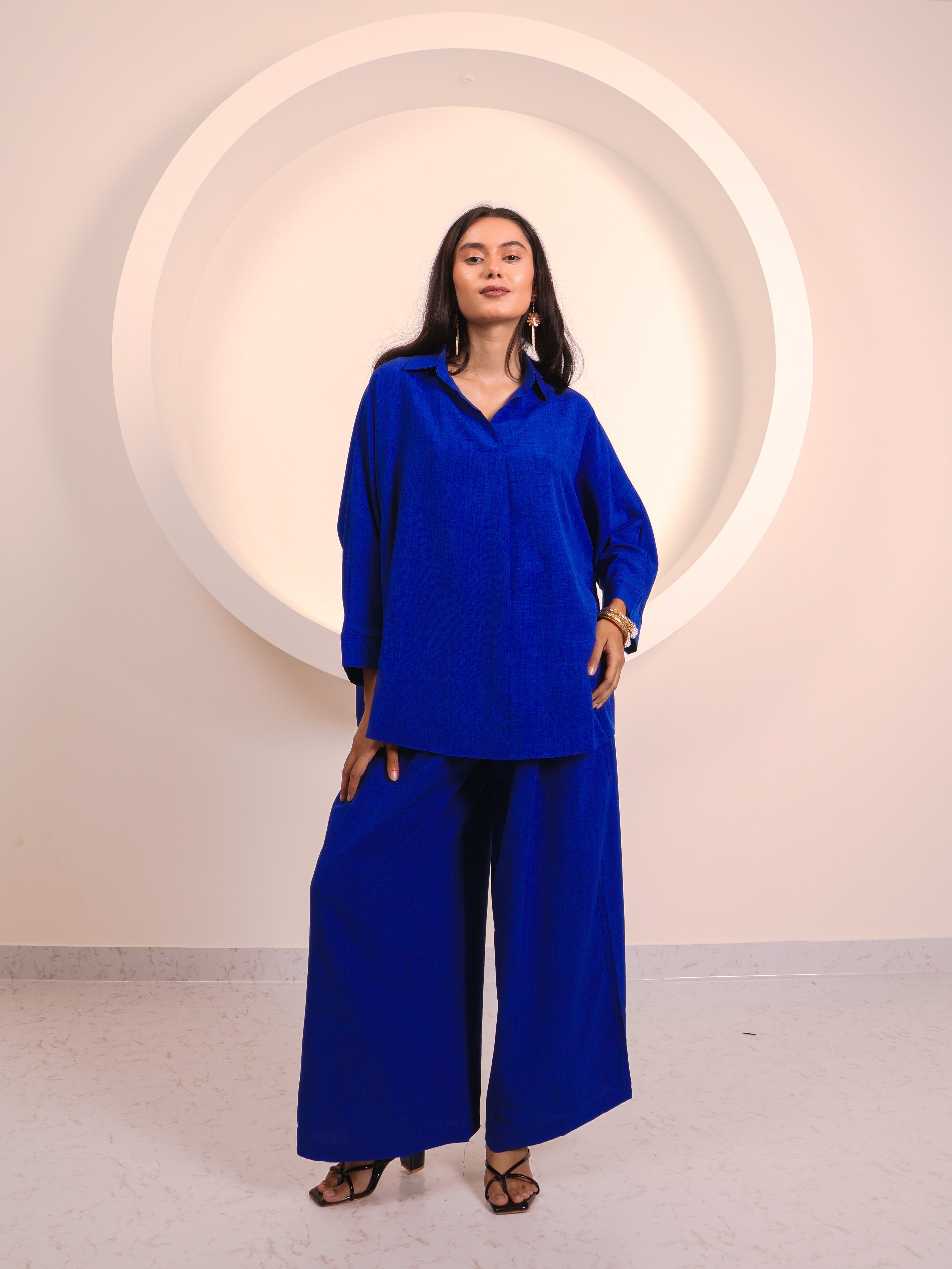 Chic, versatile, and endlessly comfortable—this co-ord set is crafted to flatter across occasions. The relaxed-fit shirt features a collared neckline and 3/4th sleeves, giving it a breezy yet refined appeal. Paired with straight-leg trousers that drape effortlessly, the silhouette strikes the right balance between ease and elegance. Available in a range of colors—from subtle neutrals to bold statement tones—each shade tells a different style story. Dress it down for casual outings or elevate it with jewelry and heels for evening polish.