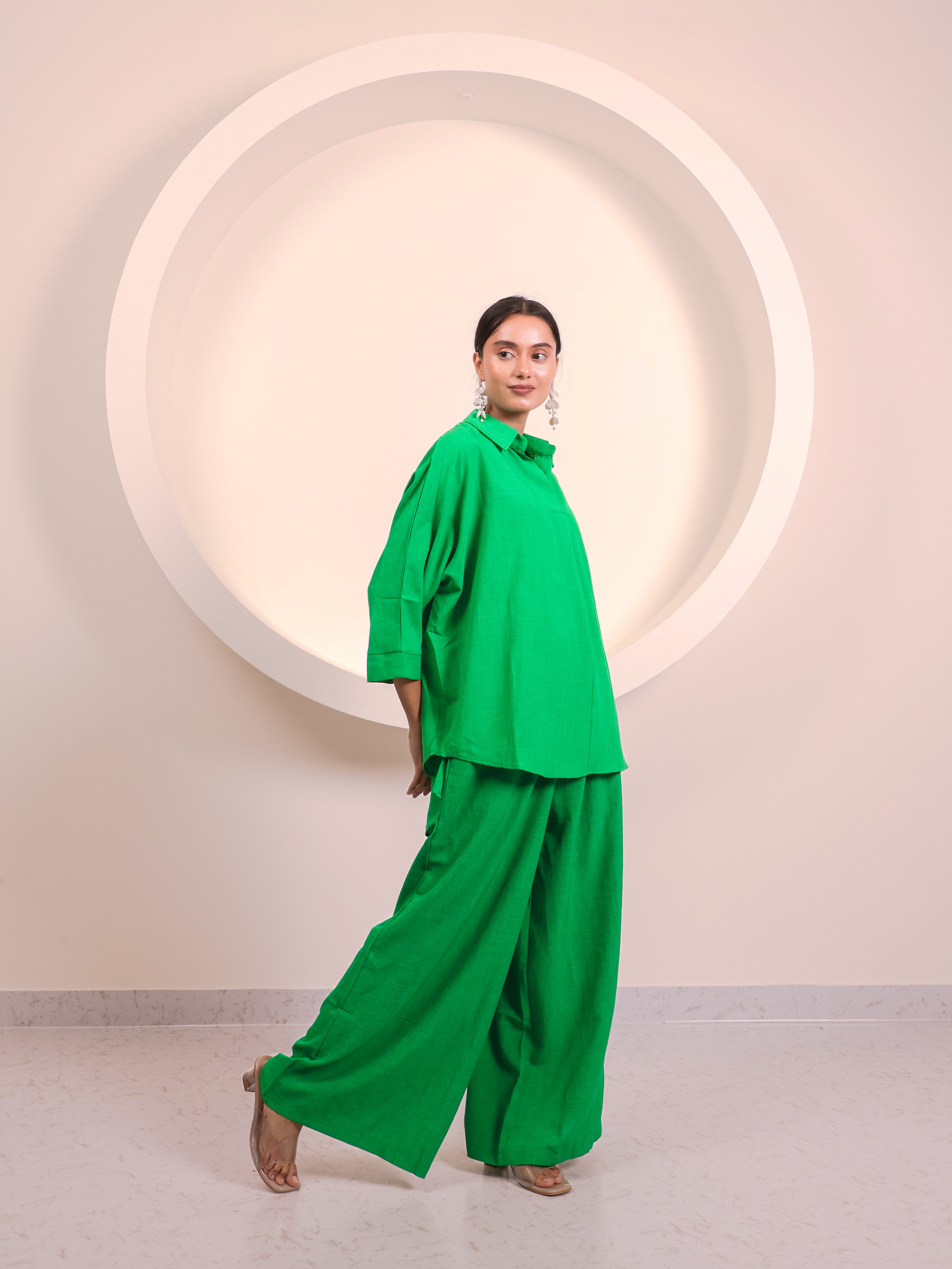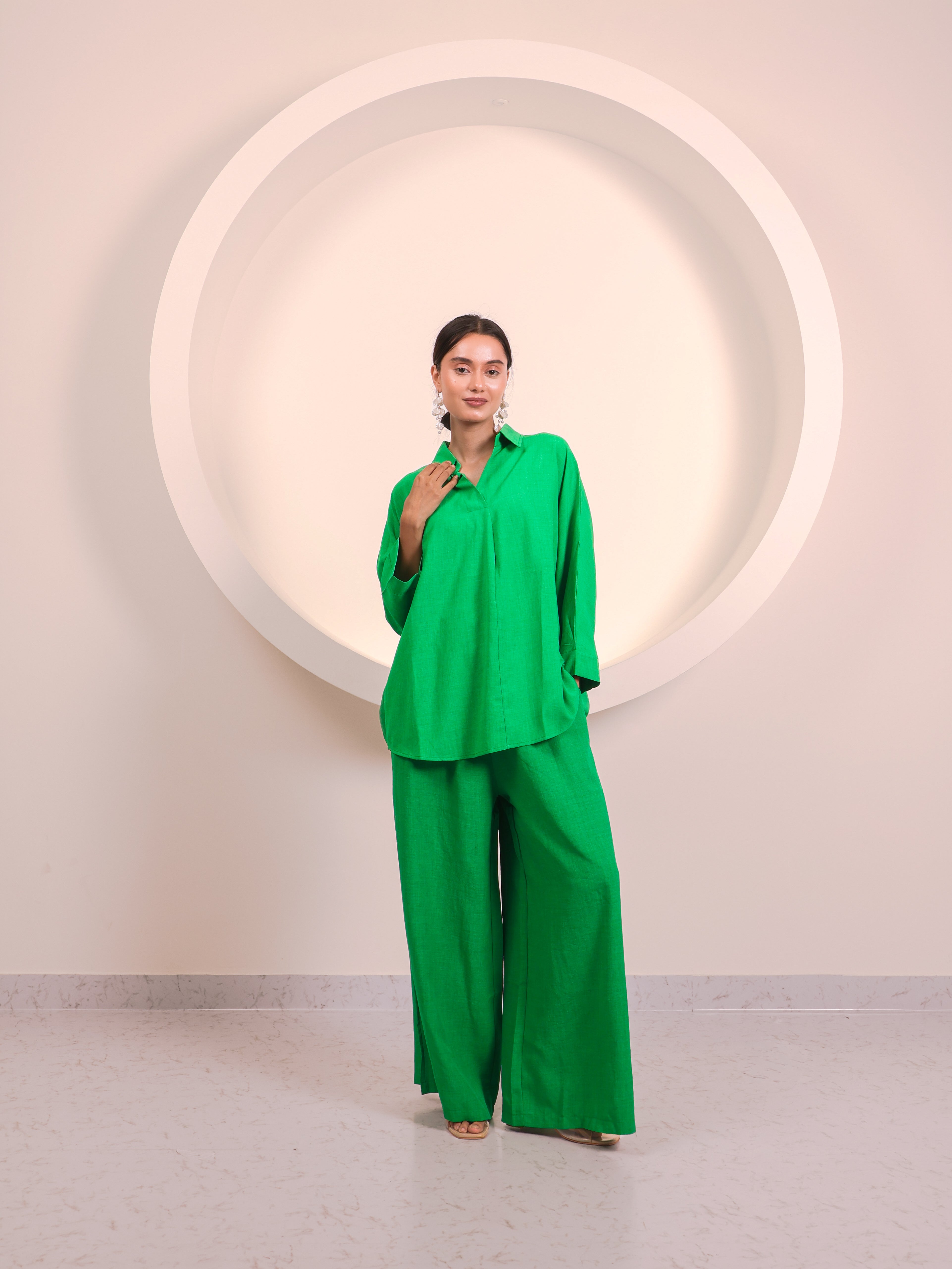 Chic, versatile, and endlessly comfortable—this co-ord set is crafted to flatter across occasions. The relaxed-fit shirt features a collared neckline and 3/4th sleeves, giving it a breezy yet refined appeal. Paired with straight-leg trousers that drape effortlessly, the silhouette strikes the right balance between ease and elegance. Available in a range of colors—from subtle neutrals to bold statement tones—each shade tells a different style story. Dress it down for casual outings or elevate it with jewelry and heels for evening polish.