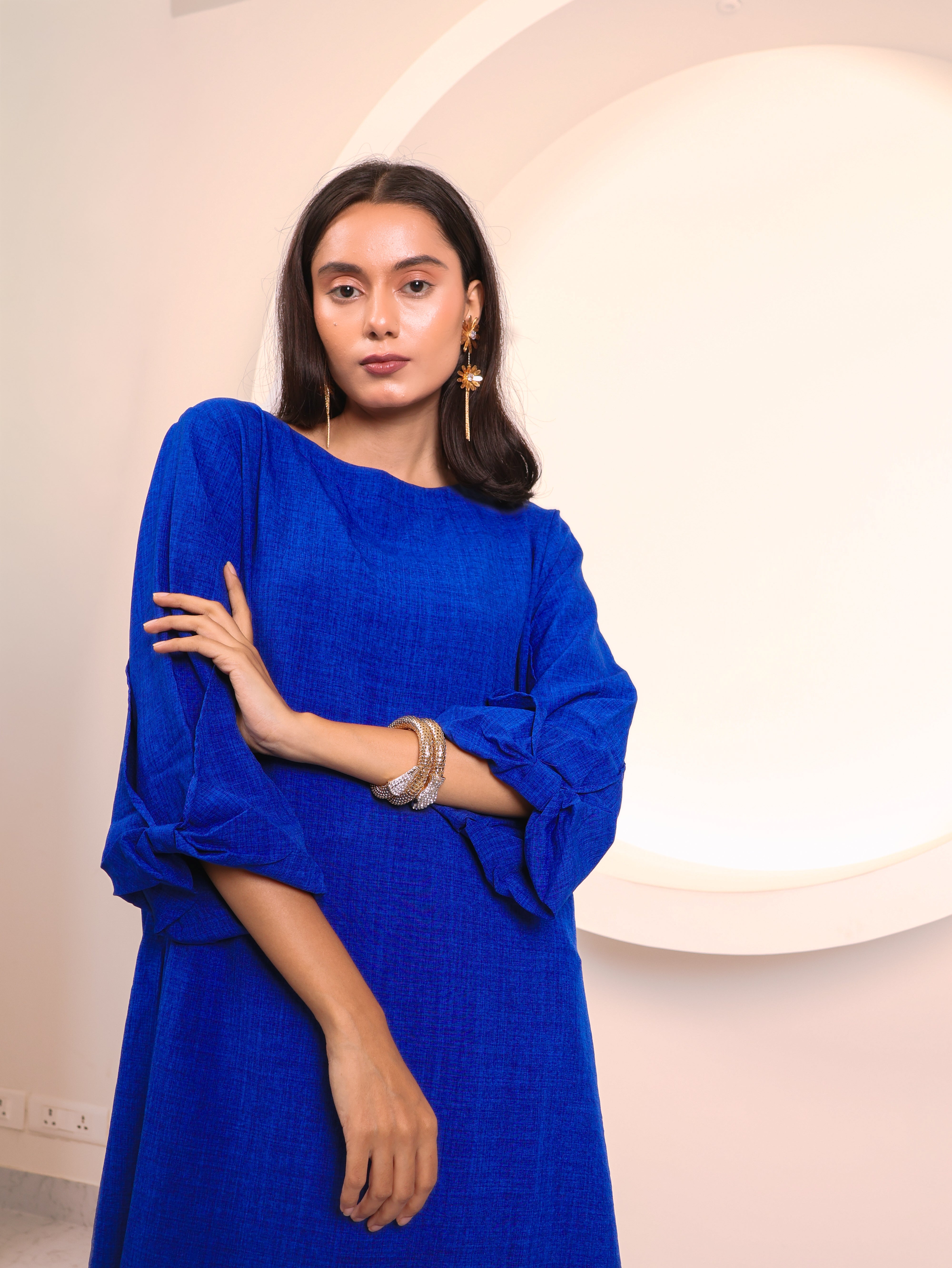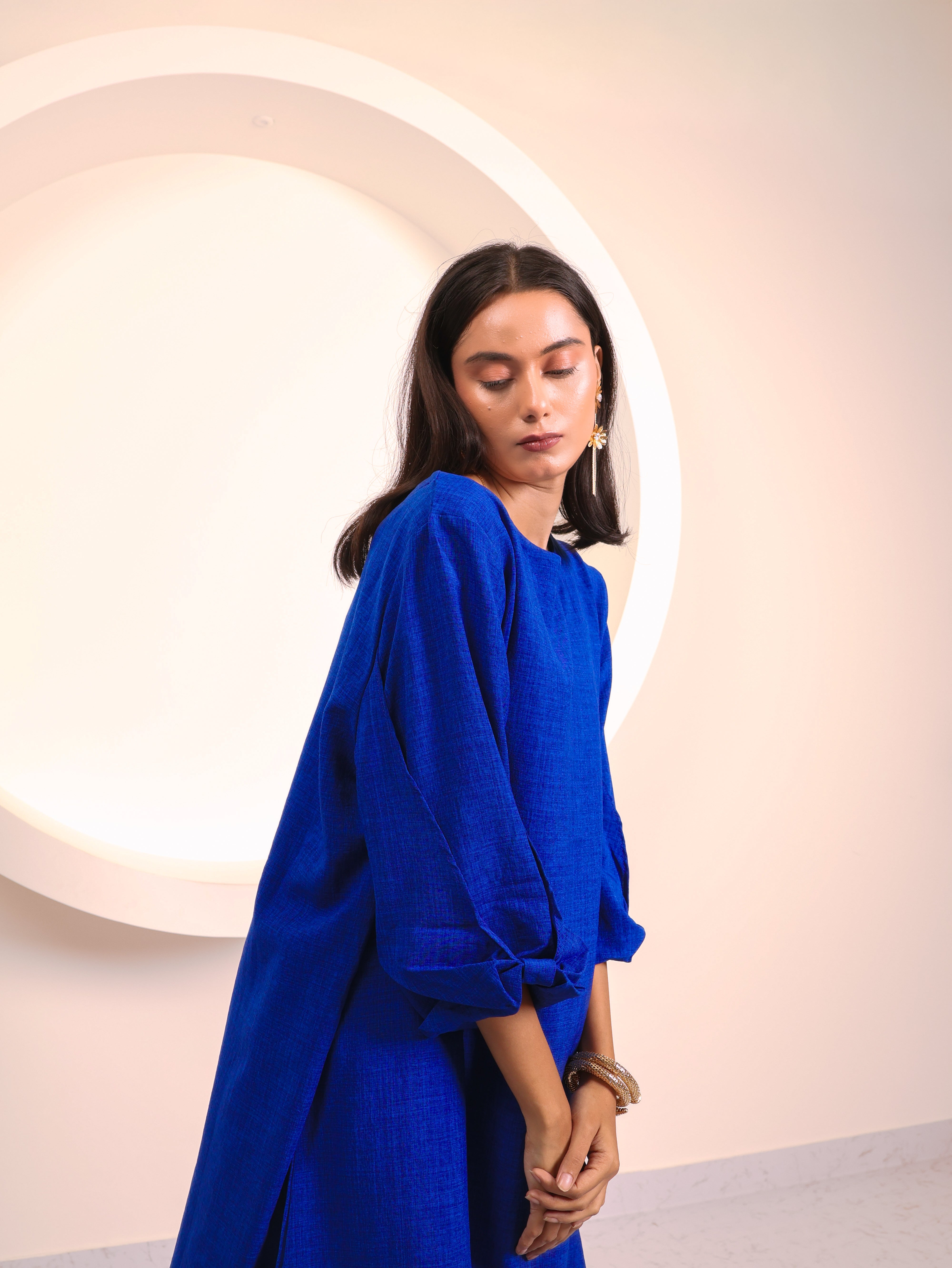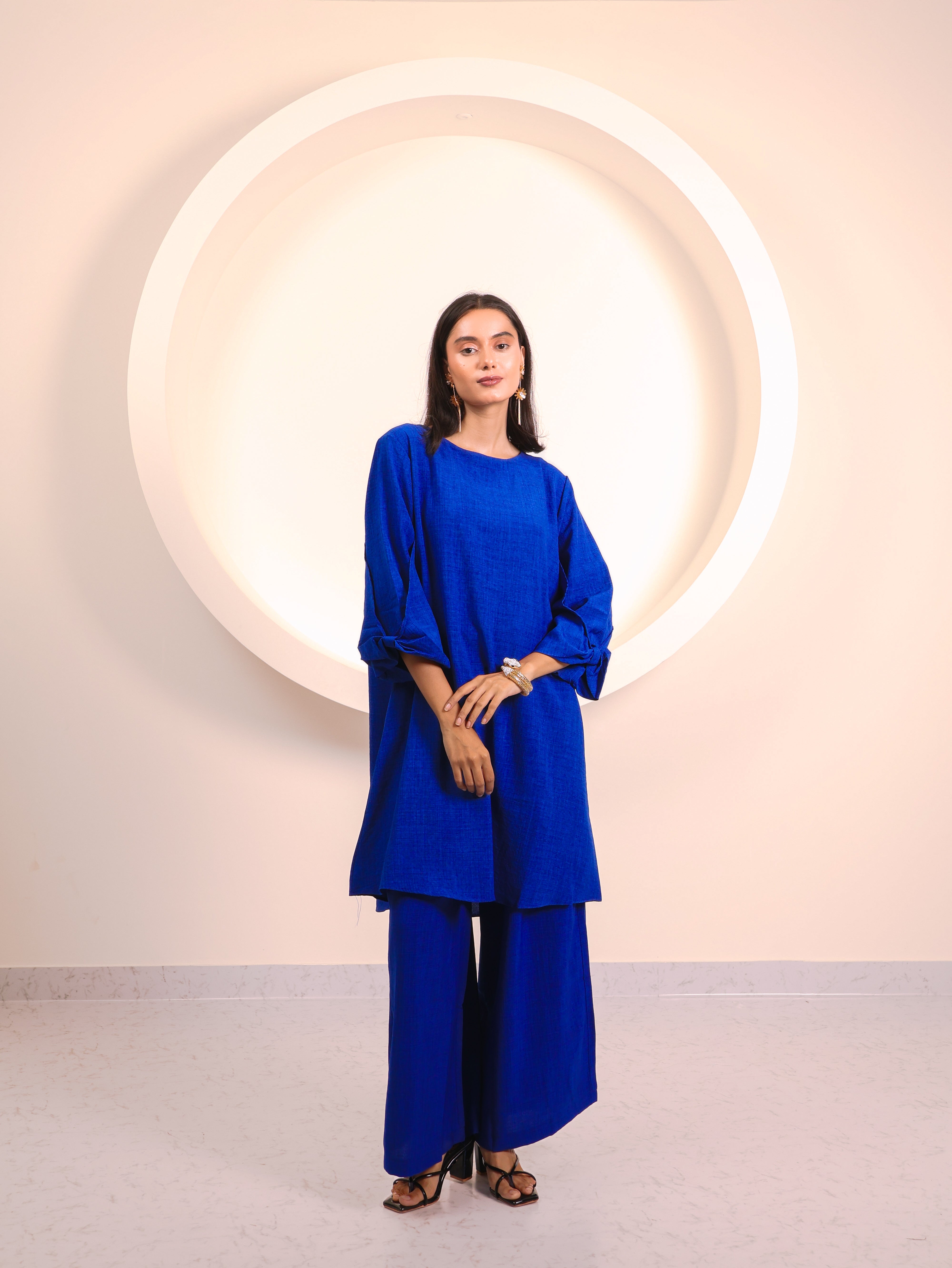 A perfect blend of elegance and ease, this co-ord set is crafted to keep you stylish and comfortable all day long. The long tunic-style top features a round neckline and 3/4th sleeves with tie-up detailing, adding a subtle feminine touch. Paired with wide-leg trousers, it creates a flowy, graceful silhouette that works beautifully for both casual outings and elevated occasions.