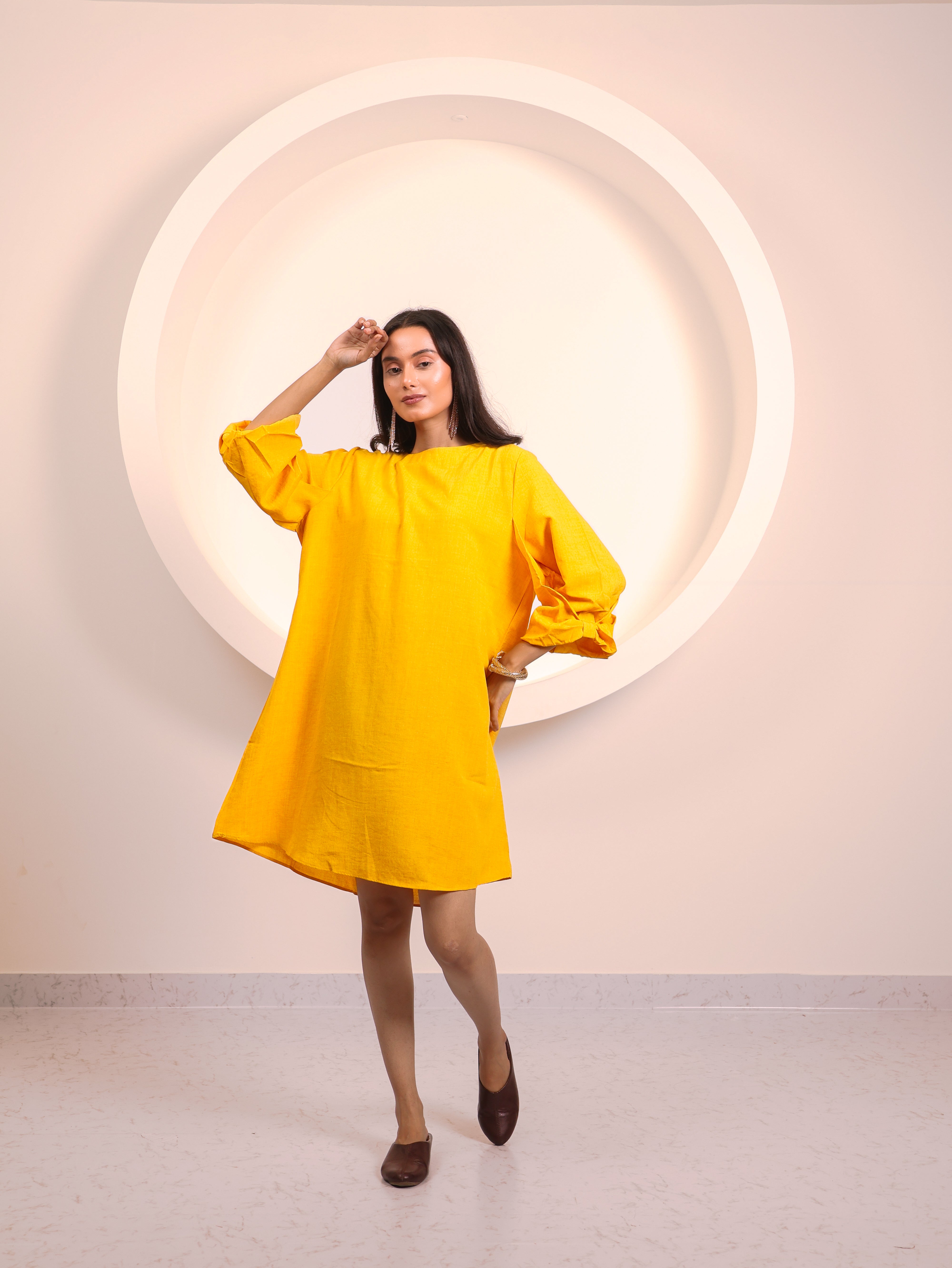 Chic and versatile, this tunic dress is designed for effortless everyday elegance. Featuring a round neckline and 3/4th sleeves with soft fold detailing, it flows into a relaxed A-line silhouette that falls just above the knee. Lightweight and breathable, it offers the perfect balance of comfort and style—whether dressed up with heels and jewelry or worn casually with flats.