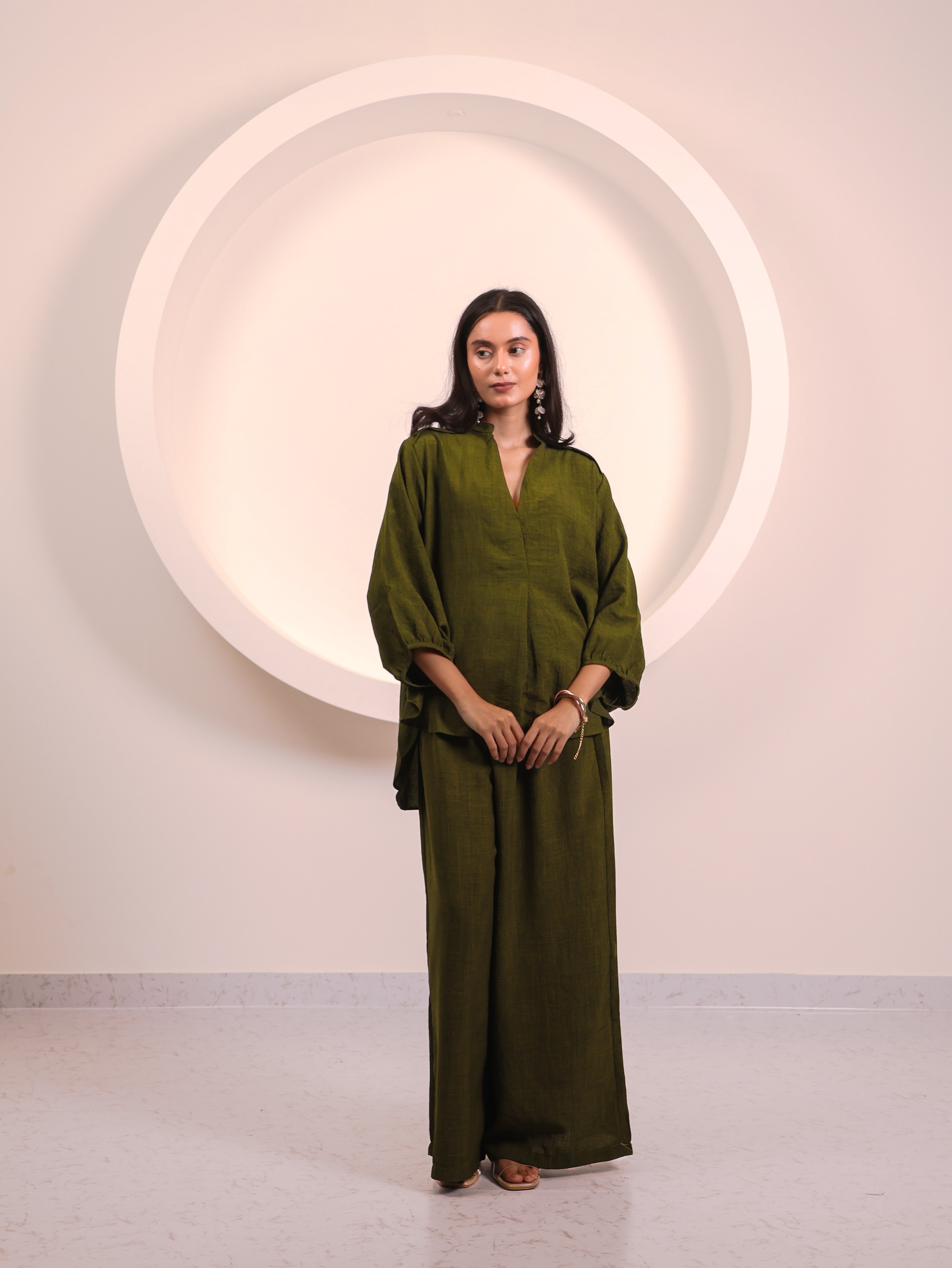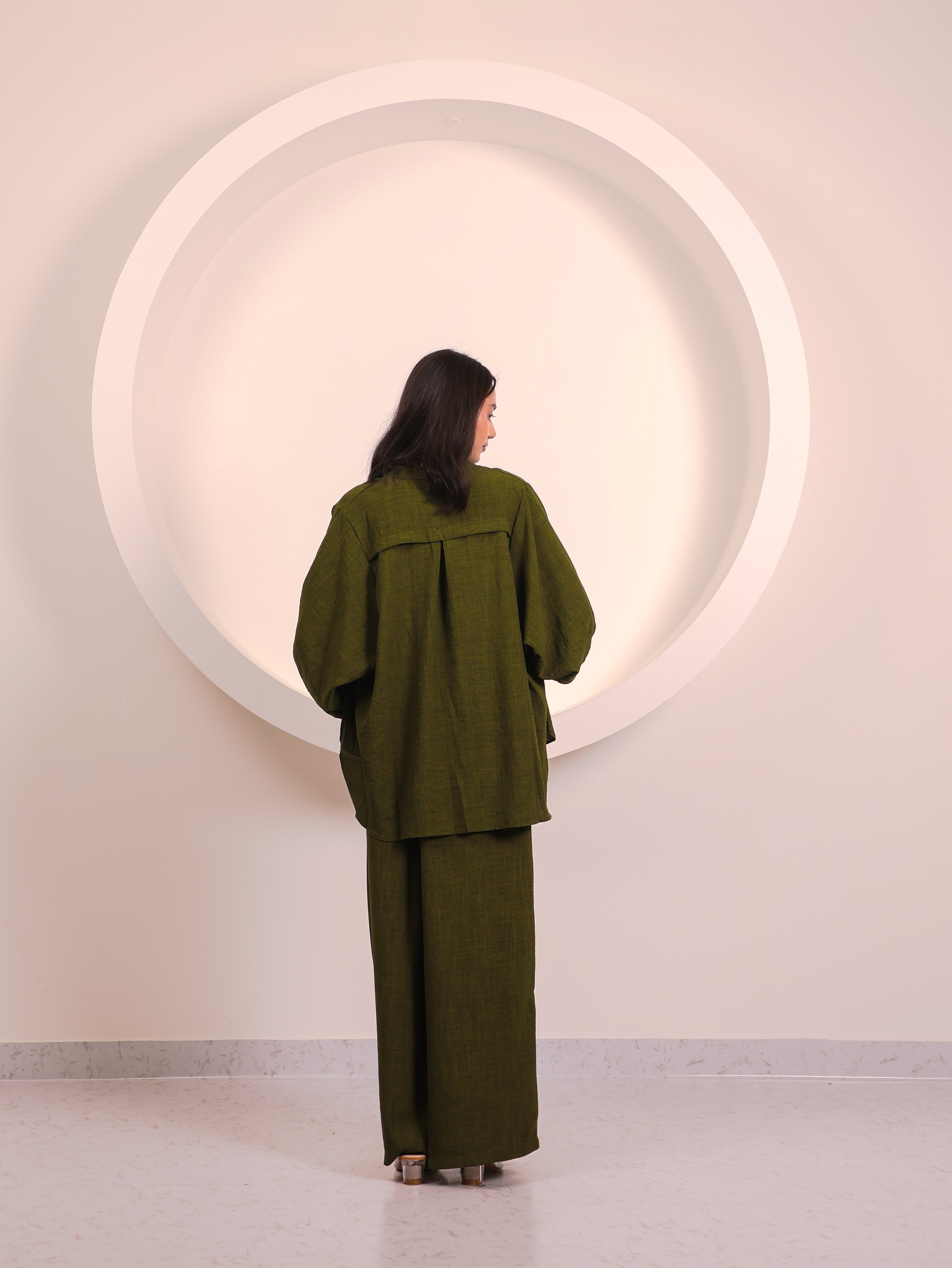 The Olive Co-ord Set, made in cotton blend fabric, blends comfort with effortless style. Its refined design adds a distinctive touch, making it a standout addition to any wardrobe. A versatile essential to elevate your everyday fashion.