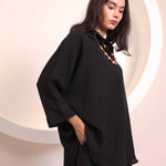 Minimalist and versatile, this relaxed-fit collared top is a timeless wardrobe essential. Designed with 3/4th sleeves and a clean, structured neckline, it offers effortless elegance without compromising on comfort. Its easy length makes it perfect to pair with wide-leg trousers, denims, or skirts, allowing endless styling possibilities.