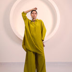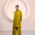 Chic and versatile, this co-ord set is designed to flatter every mood. The knee-length shirt with a collared neckline and 3/4th sleeves flows effortlessly, giving you the option to wear it as a statement top or style it solo as a dress. Paired with straight-leg trousers, the look balances comfort with modern sophistication. Available in multiple colors, it’s the perfect piece to take you from casual outings to evening polish with ease.