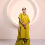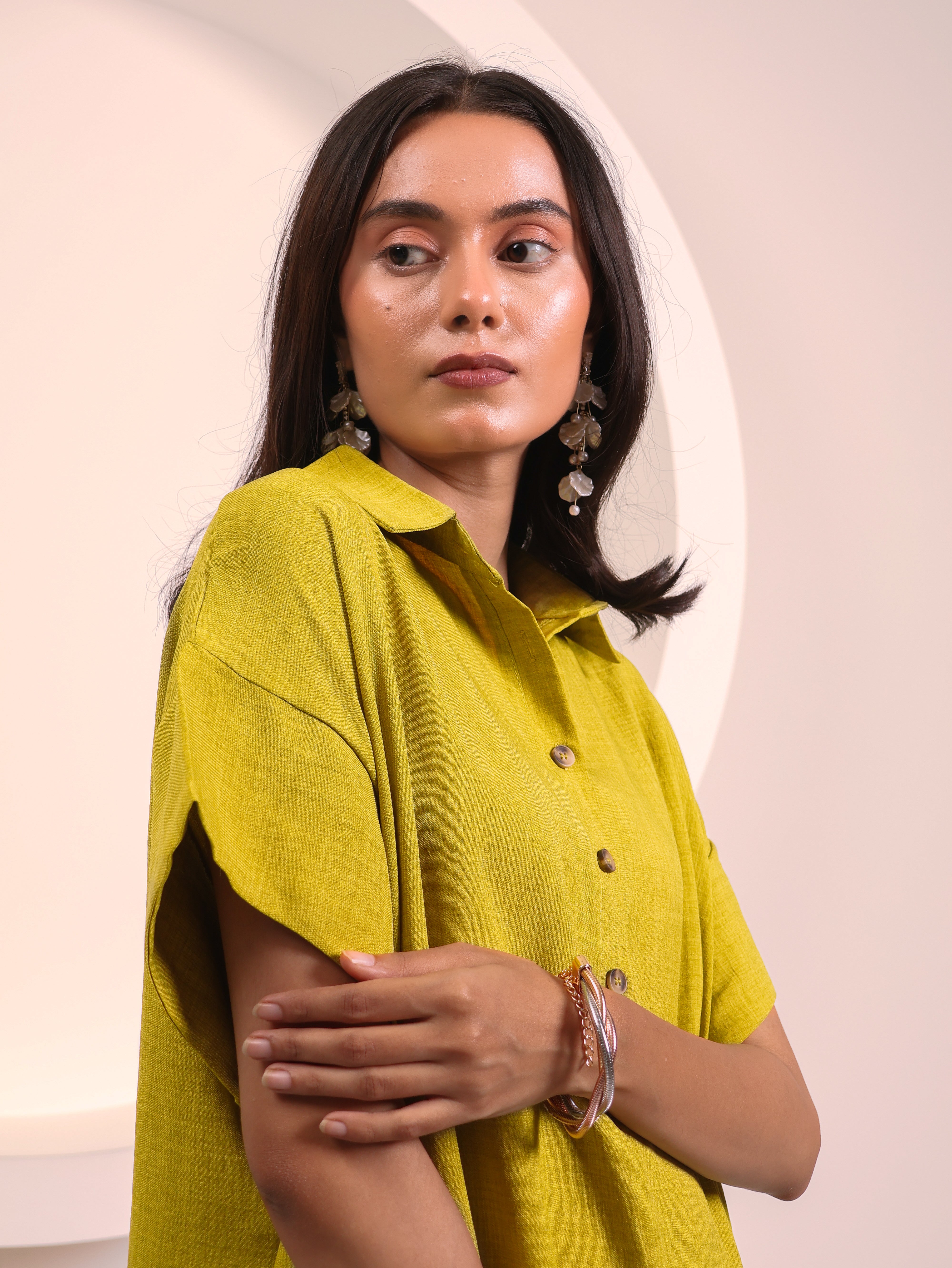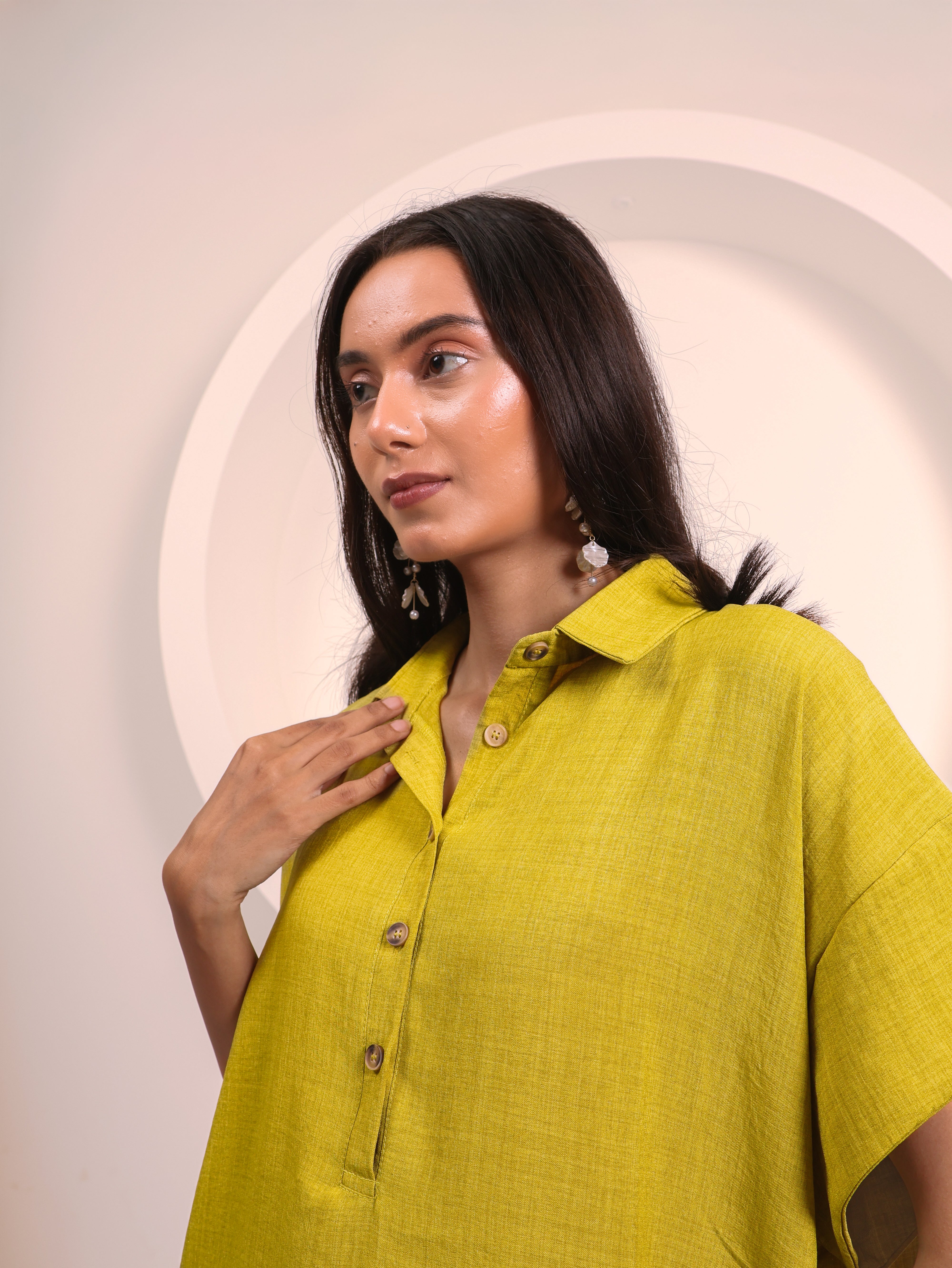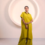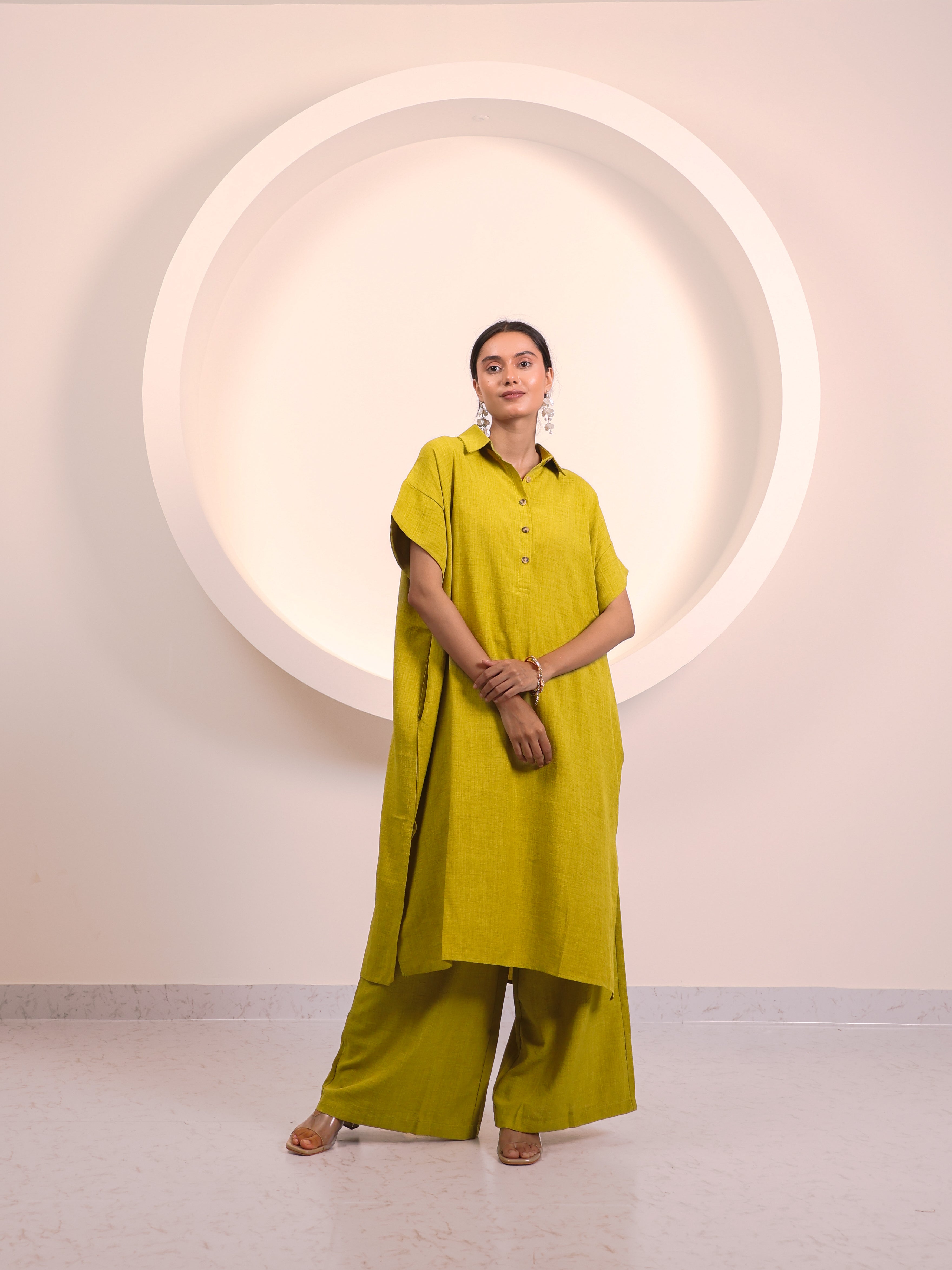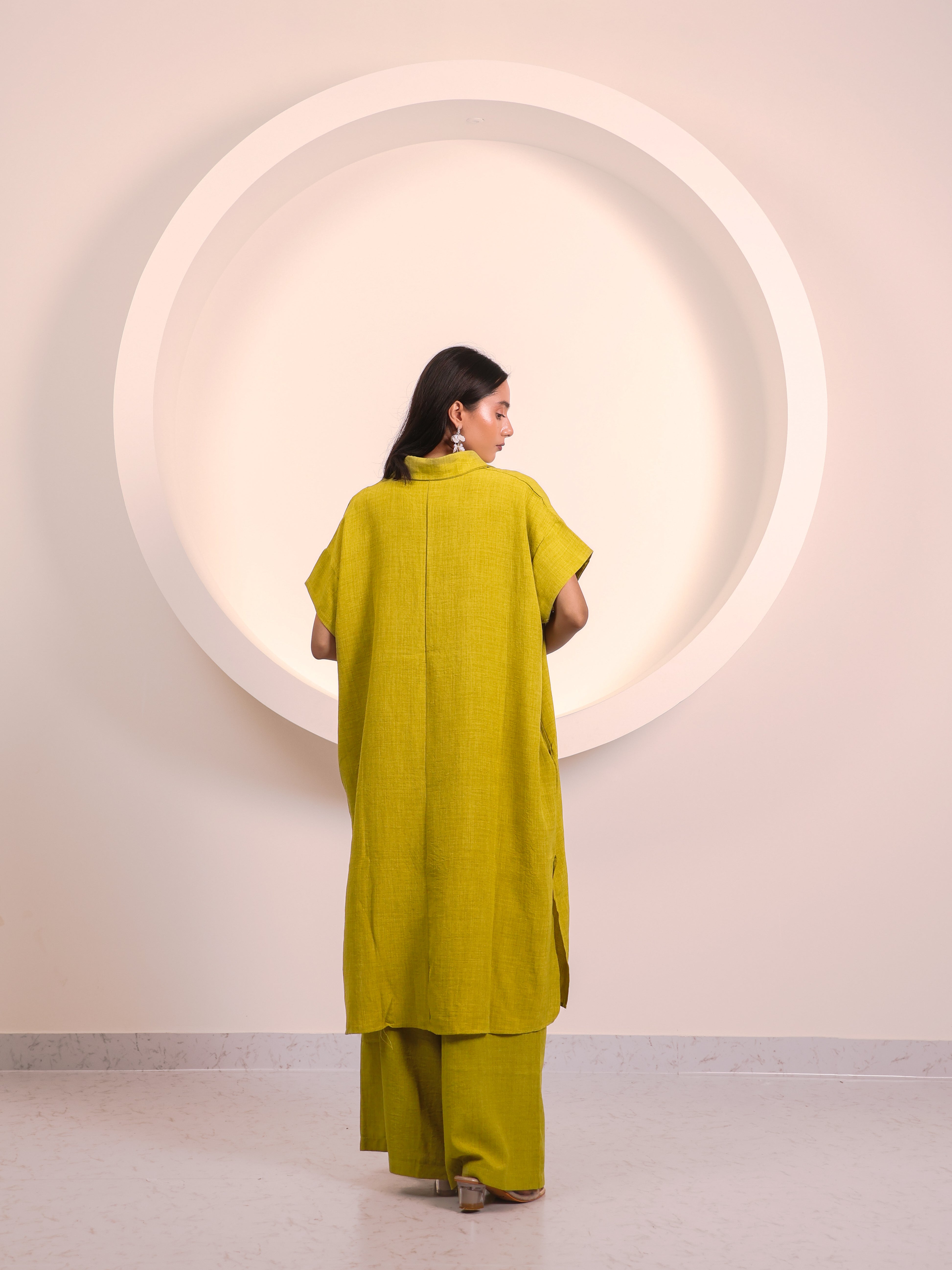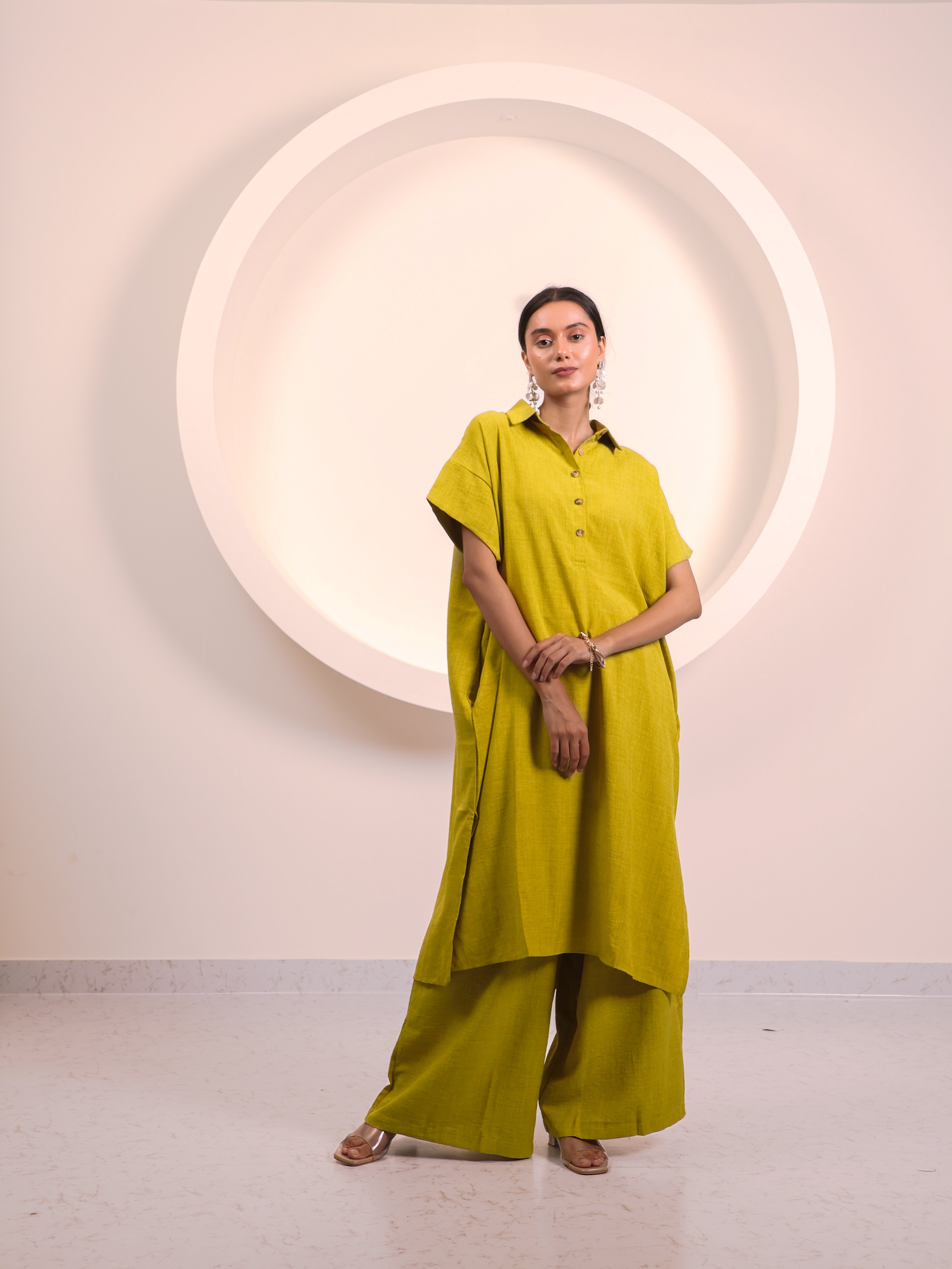 Effortlessly refined, this co-ord set combines relaxed tailoring with everyday versatility. The tunic features a button-down collar neckline and an easy, longline silhouette that flows gracefully for a polished yet laid-back look. Short sleeves with a fluid drape add to its comfort, while the side slits provide ease of movement. Paired with wide-leg trousers, it creates a modern, elegant ensemble that transitions seamlessly from work to evenings out.
