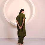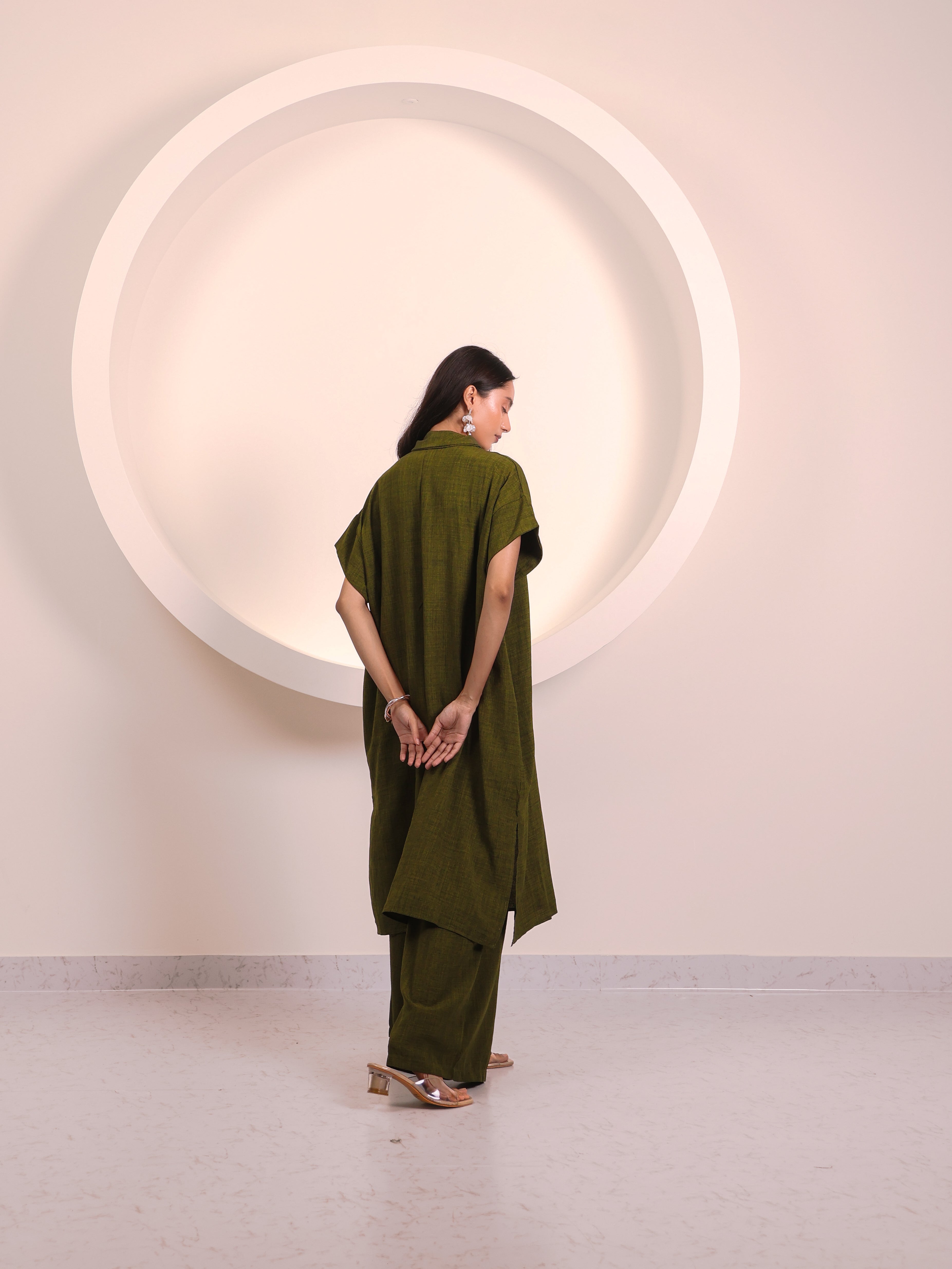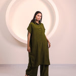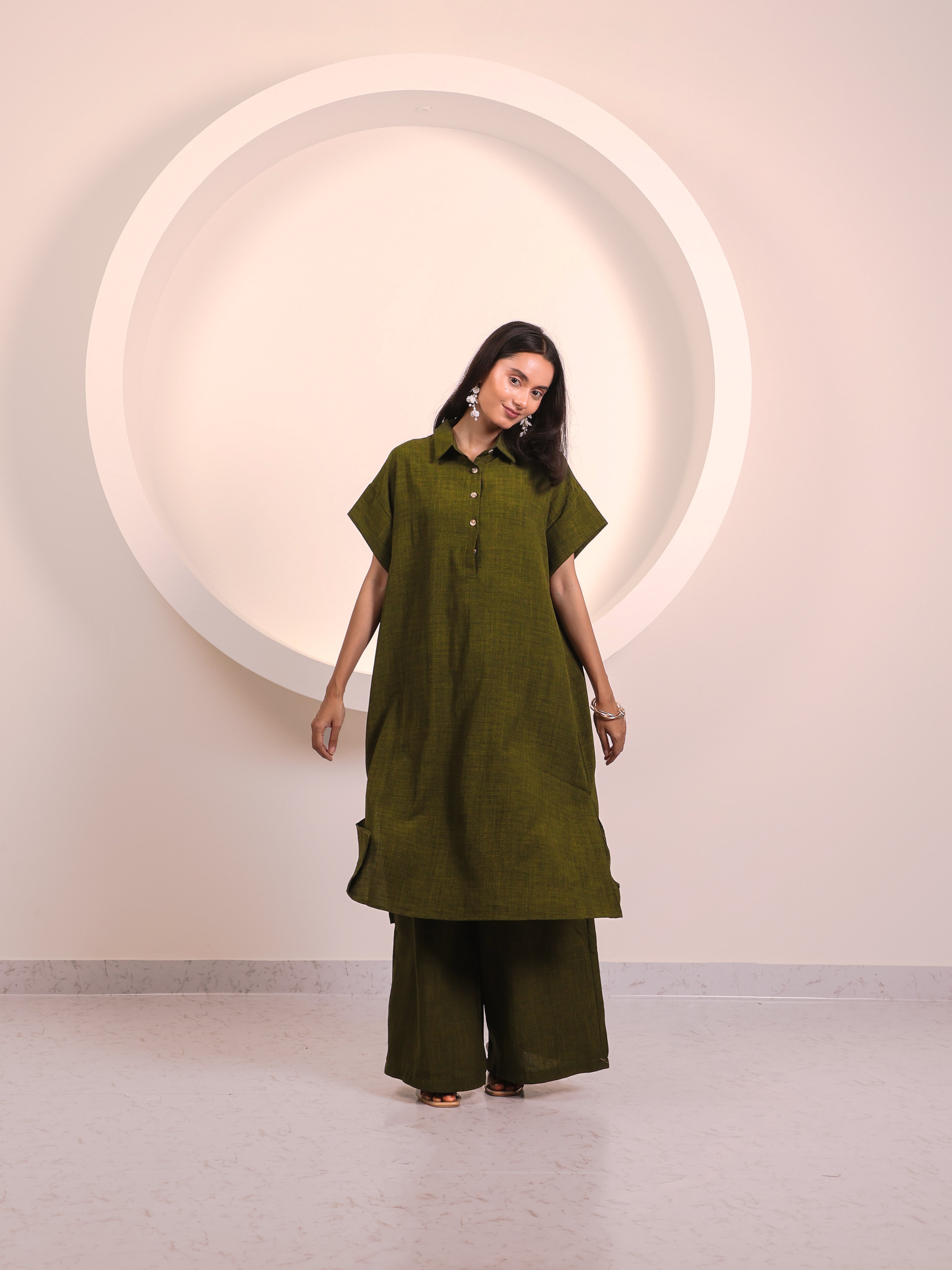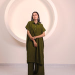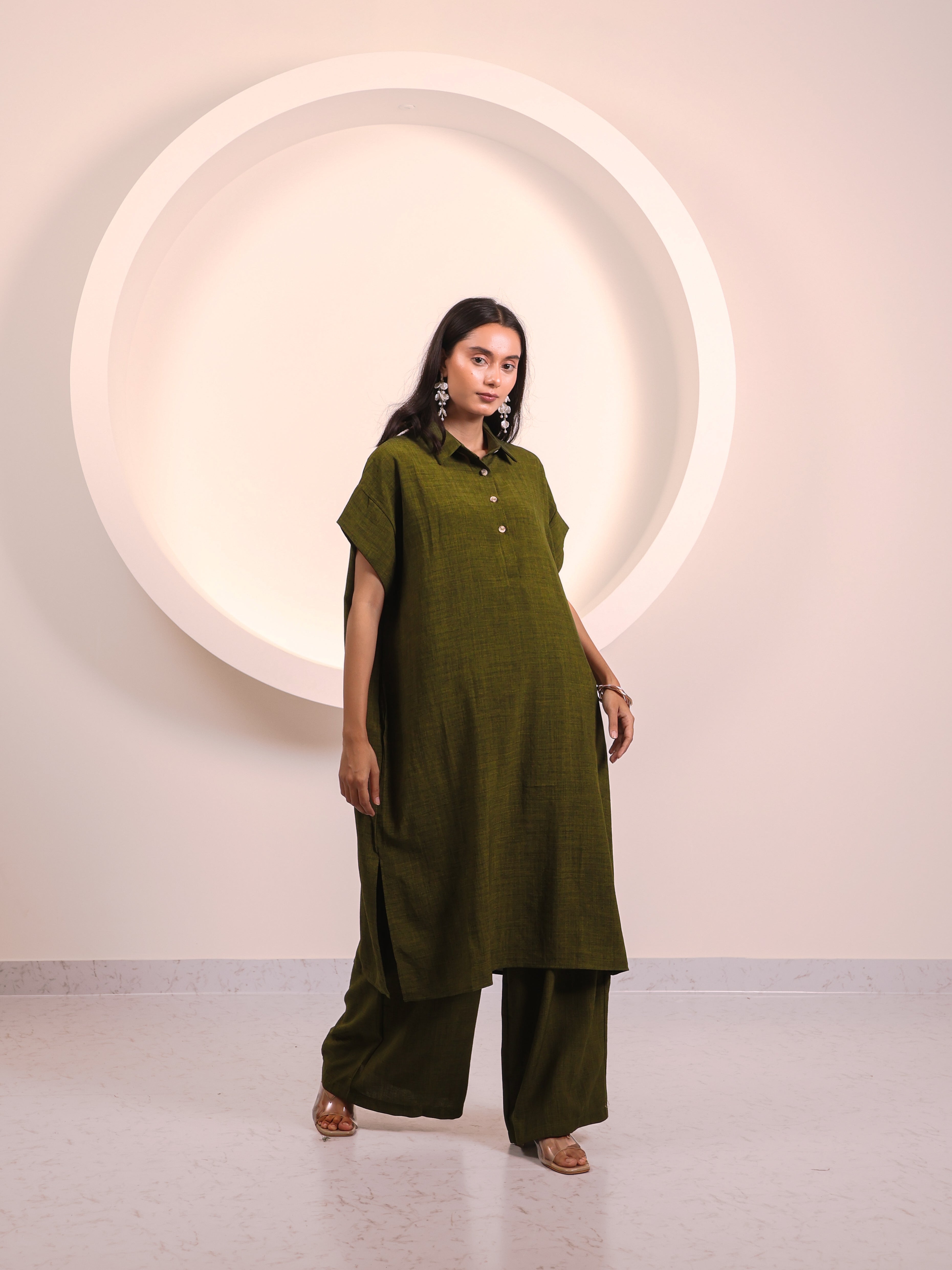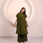 Effortlessly refined, this co-ord set combines relaxed tailoring with everyday versatility. The tunic features a button-down collar neckline and an easy, longline silhouette that flows gracefully for a polished yet laid-back look. Short sleeves with a fluid drape add to its comfort, while the side slits provide ease of movement. Paired with wide-leg trousers, it creates a modern, elegant ensemble that transitions seamlessly from work to evenings out.