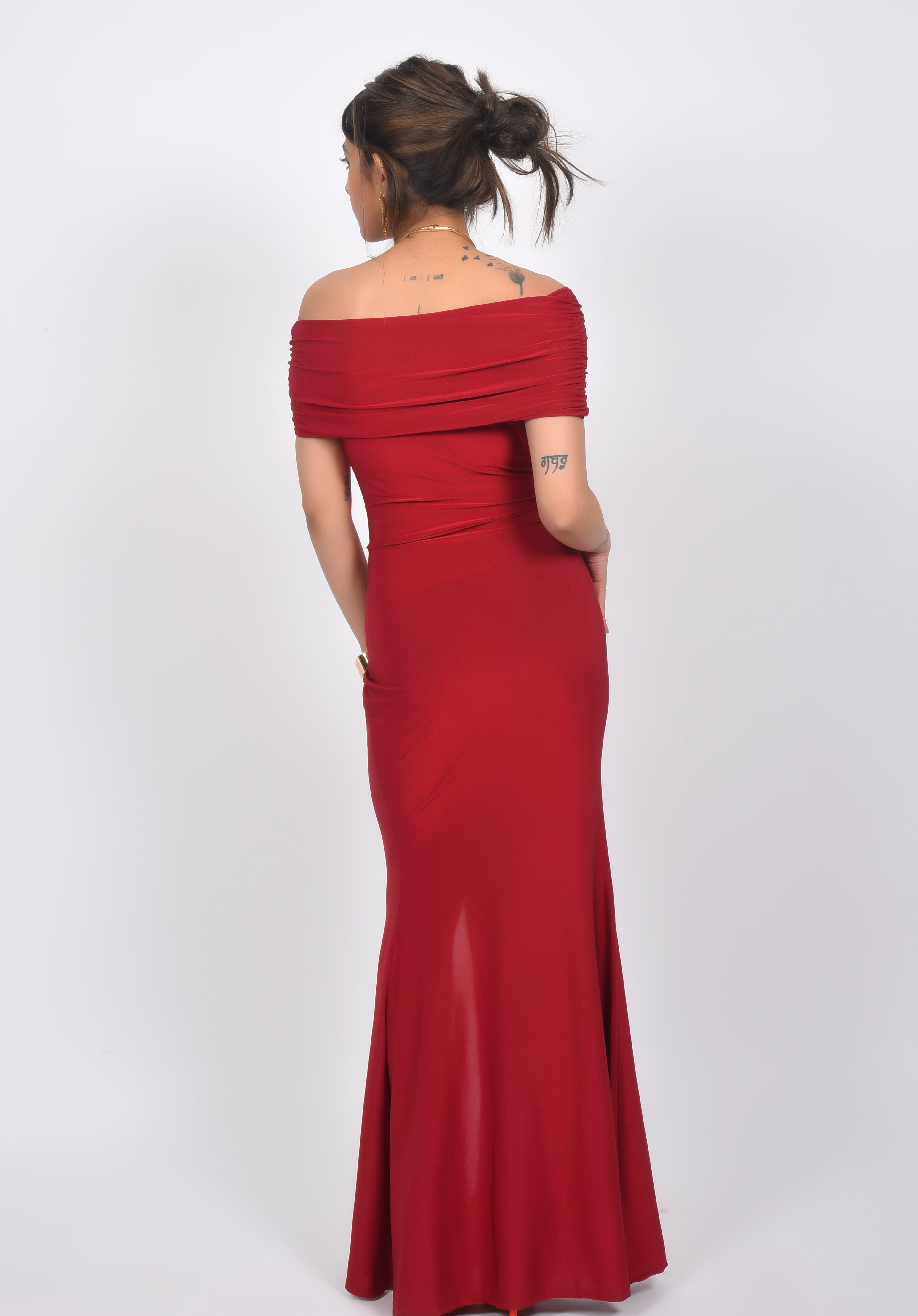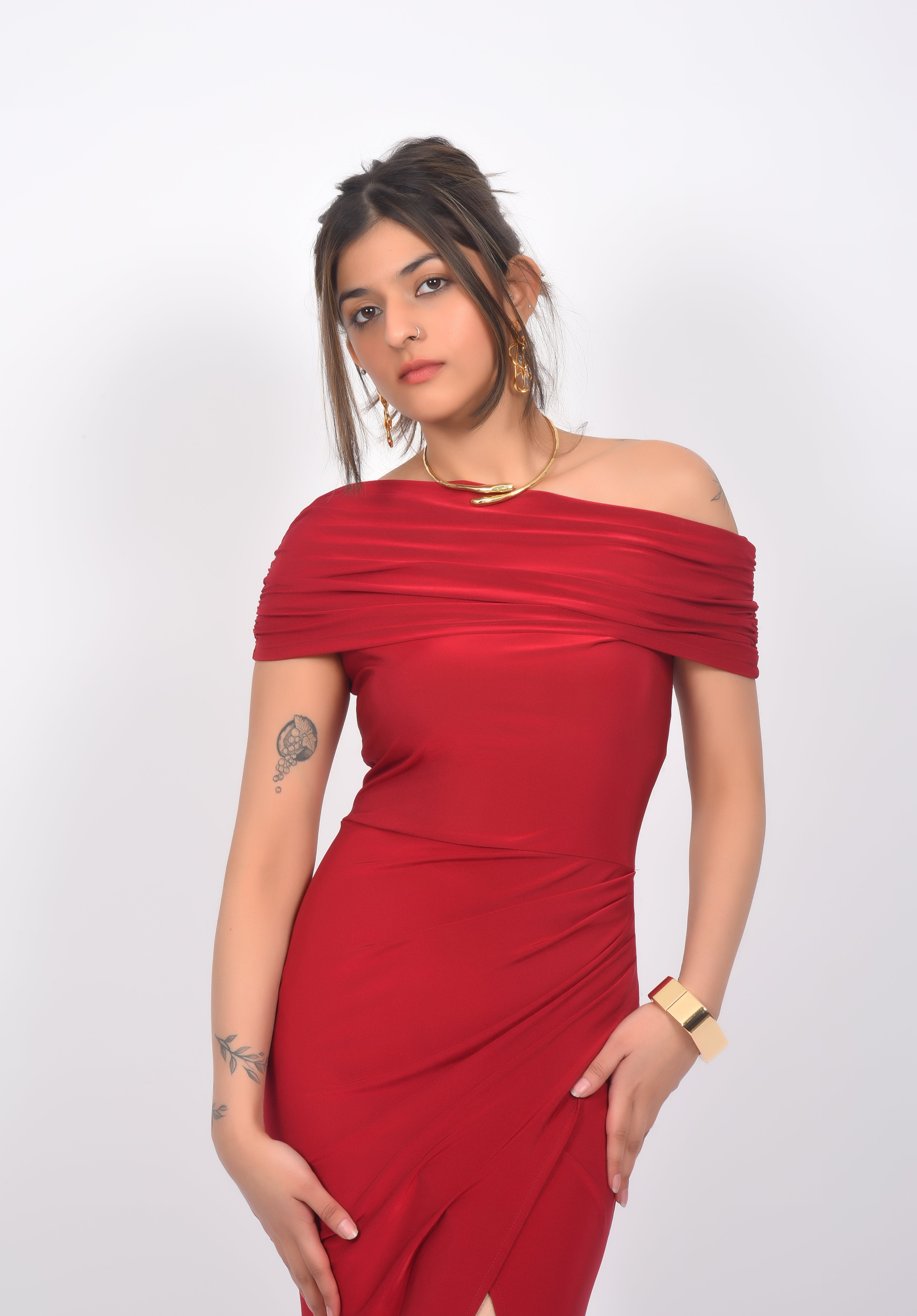 This stunning Wine Red Gown Dress in Premium Lycra is designed for versatility and sophistication.The off-shoulder neckline adds a touch of sophistication, while the adjustable draping allows for multiple styling options—wear it asymmetrically for an edgy look or keep it classic with a structured fit. Whether styled for a classic, sleek look or with a touch of drama, this gown adapts to your style effortlessly. Ideal for evening events, parties, or special occasions!