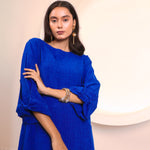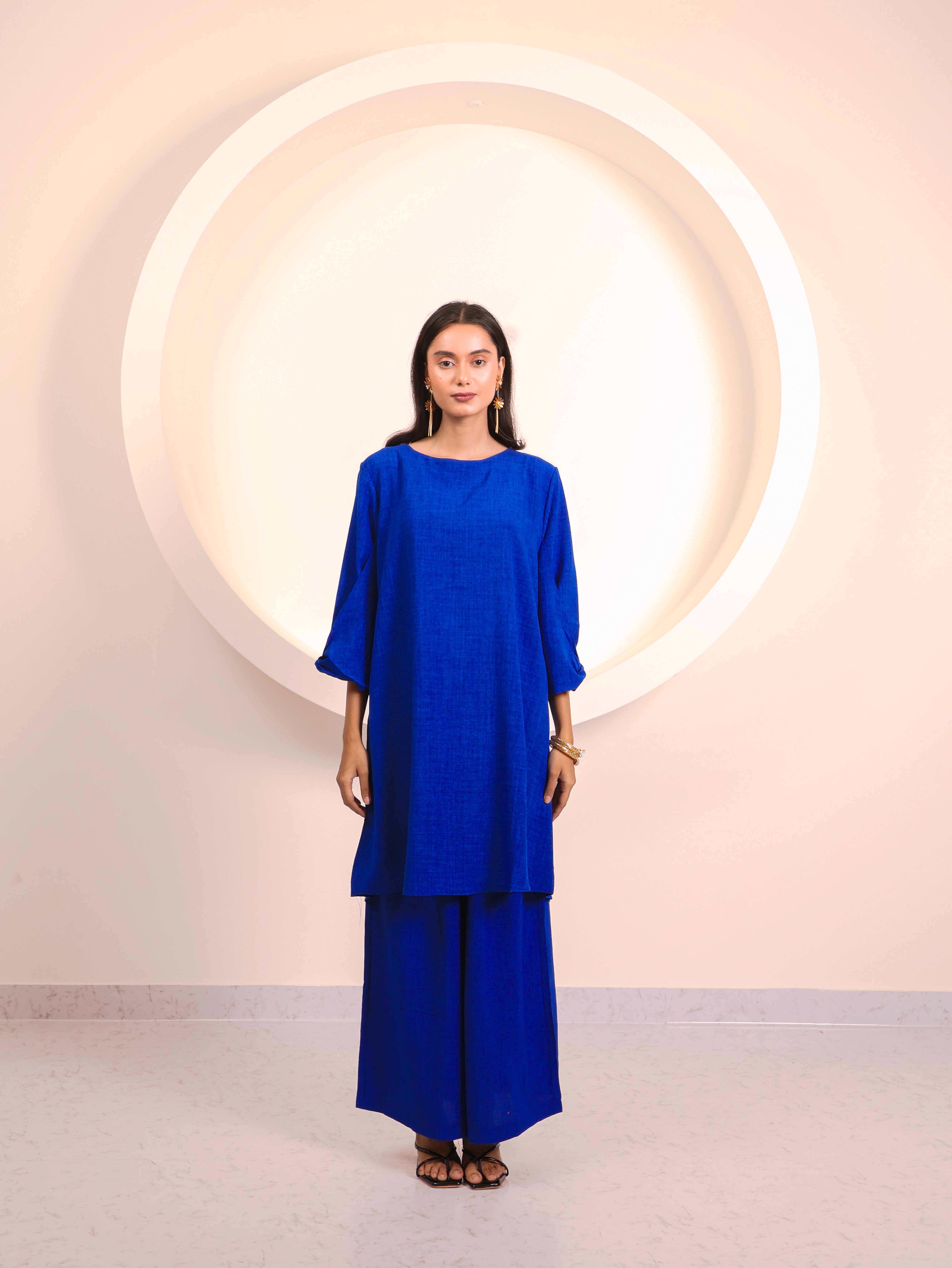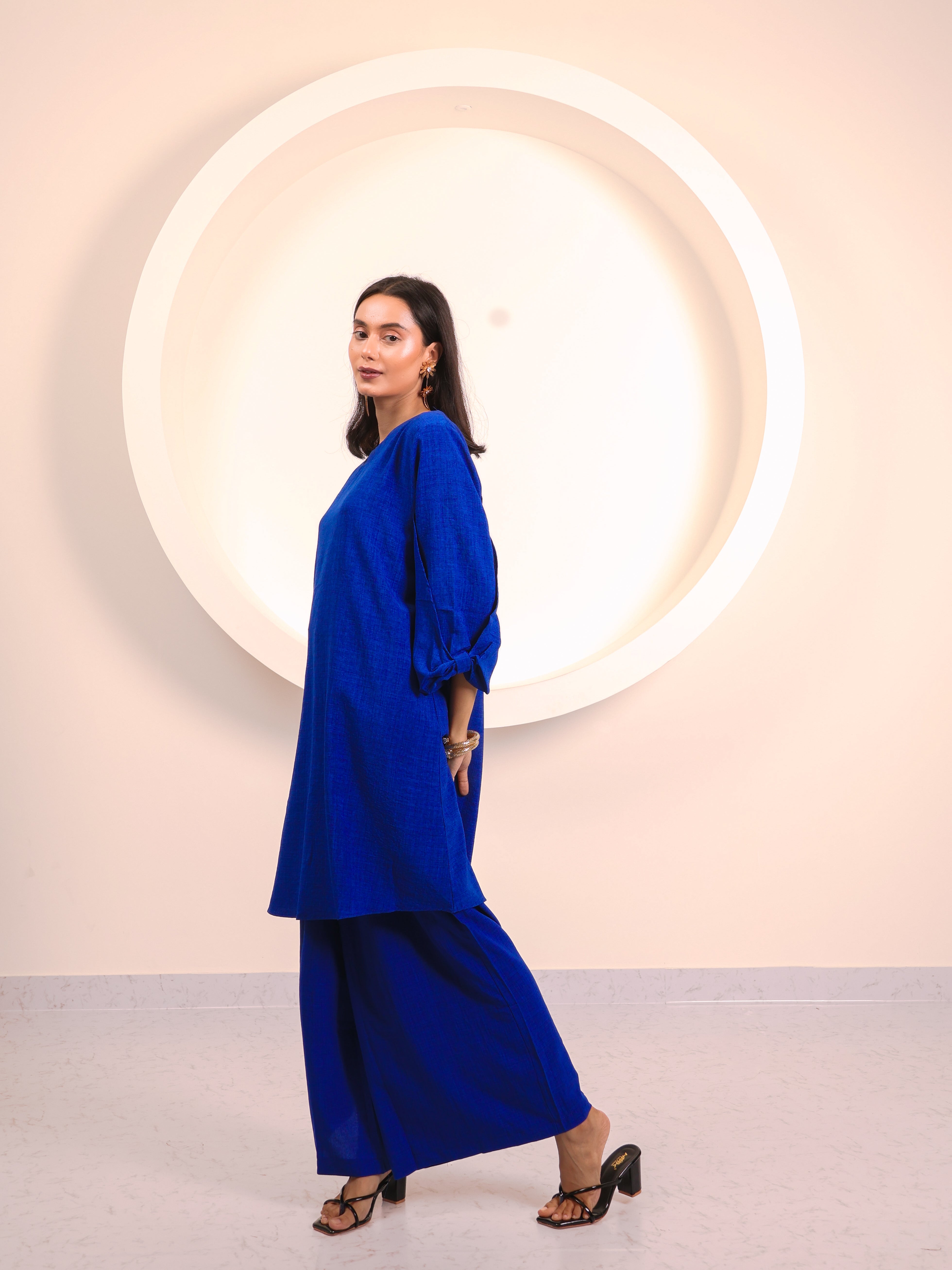 A perfect blend of elegance and ease, this co-ord set is crafted to keep you stylish and comfortable all day long. The long tunic-style top features a round neckline and 3/4th sleeves with tie-up detailing, adding a subtle feminine touch. Paired with wide-leg trousers, it creates a flowy, graceful silhouette that works beautifully for both casual outings and elevated occasions.