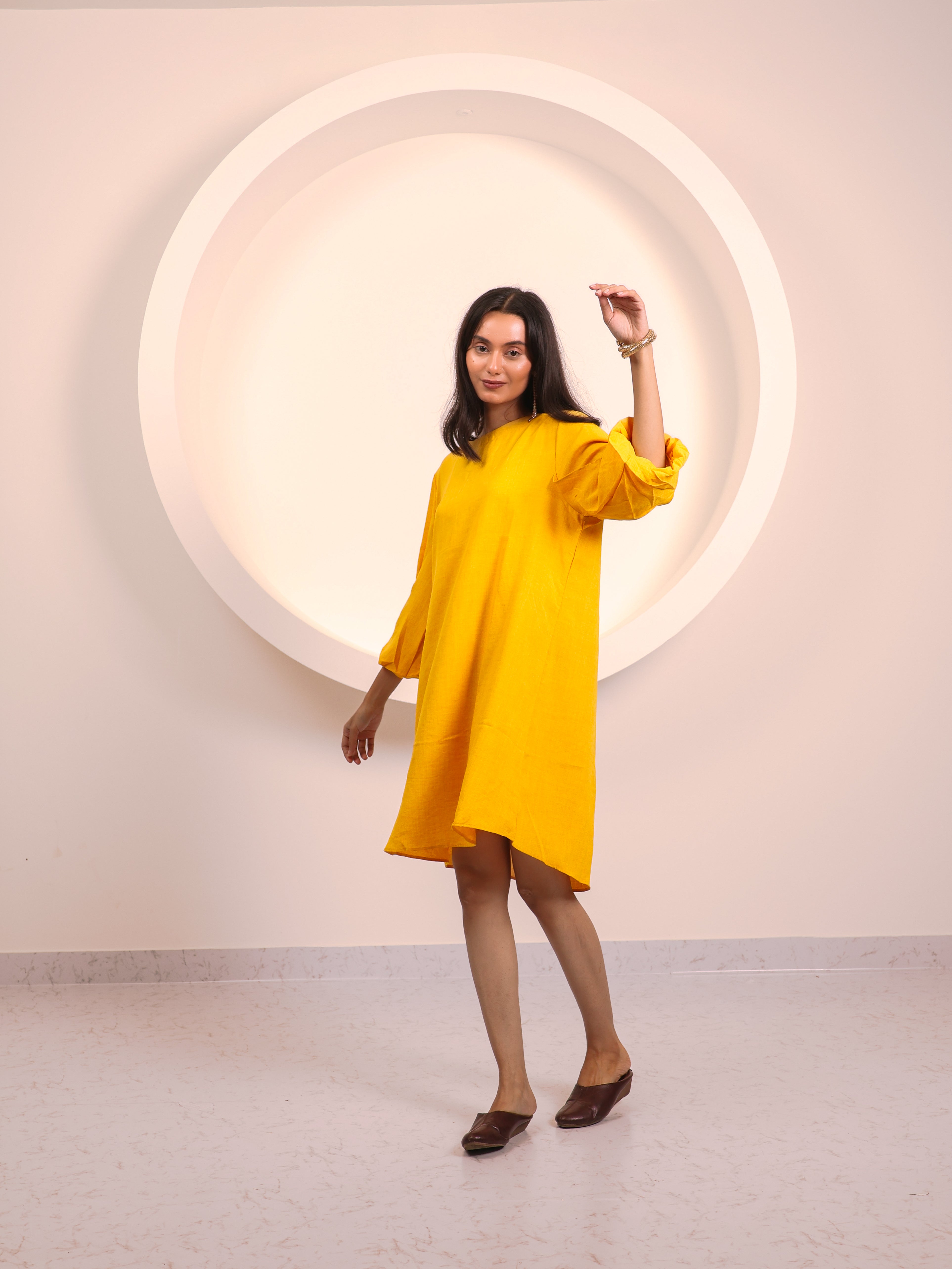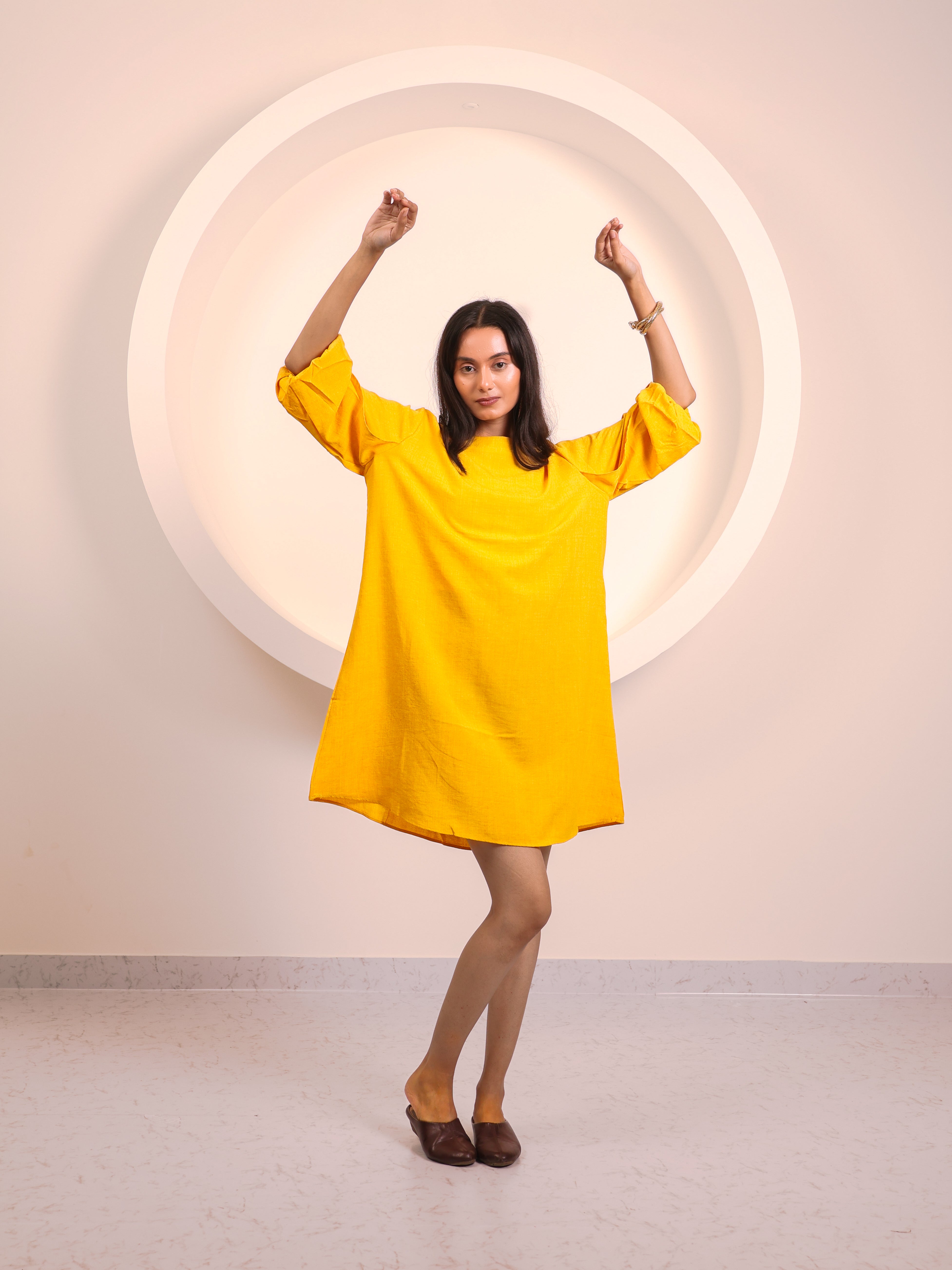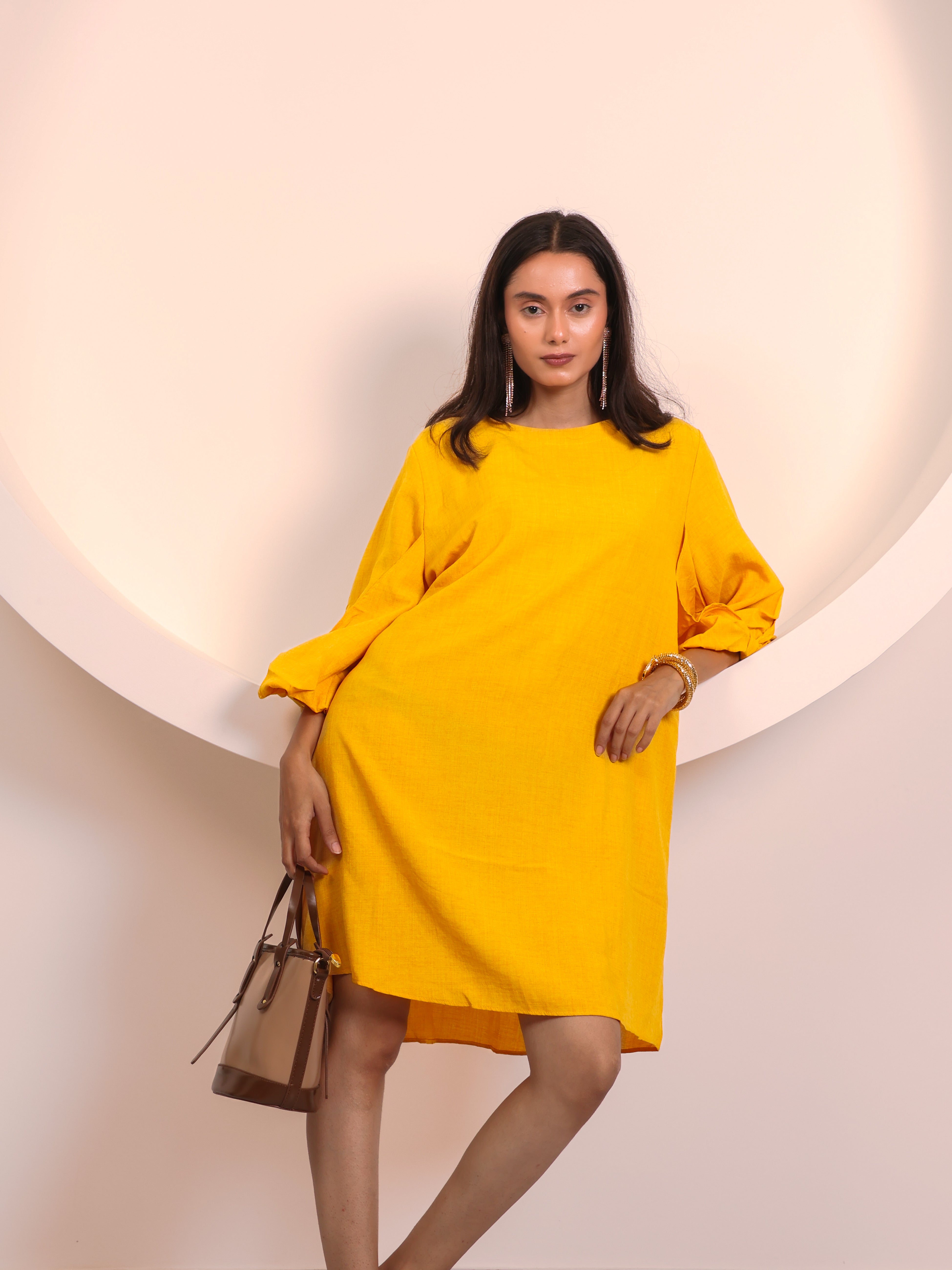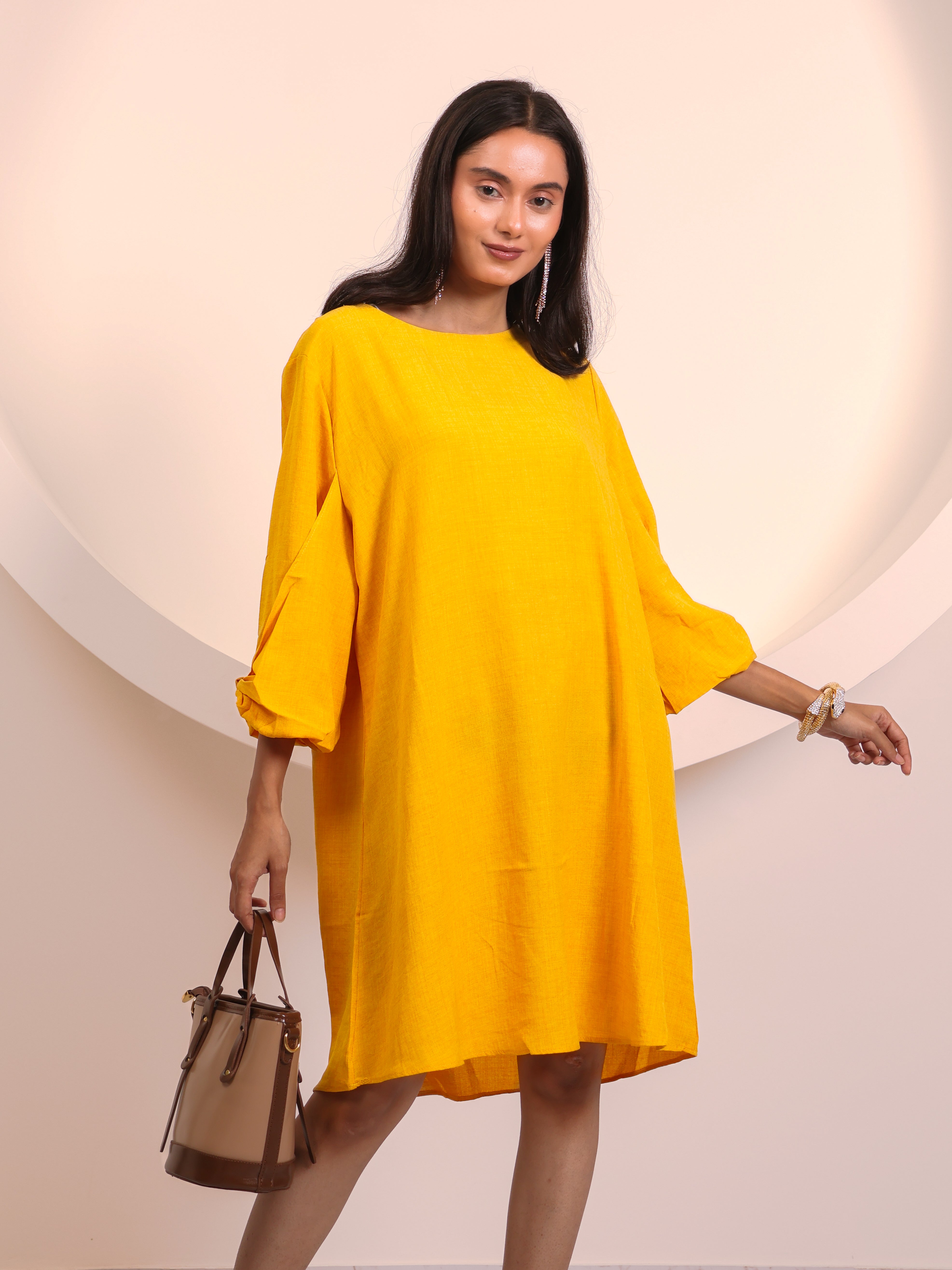 Chic and versatile, this tunic dress is designed for effortless everyday elegance. Featuring a round neckline and 3/4th sleeves with soft fold detailing, it flows into a relaxed A-line silhouette that falls just above the knee. Lightweight and breathable, it offers the perfect balance of comfort and style—whether dressed up with heels and jewelry or worn casually with flats.